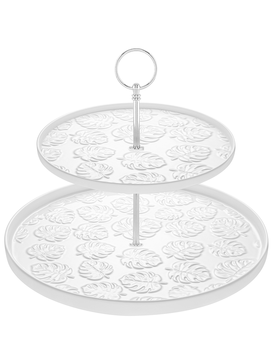 Блюдо-этажерка из серии «Тропики» от Elan Gallery предназначено для эстетичной сервировки вашего стола. Размер изделия – 28х28х24 см. Состоит из 2 блюд: 21х21х1,8 см и 28х28х2 см. Выполнены из высококачественного белого фарфора. Он не впитывает цвет продуктов и легко отмывается, благодаря чему надолго сохраняет свою белизну. Поверхность украшена рельефным узором в виде тропических листьев. Закреплены на серебряной металлической оси. Расстояние между ярусами – 10 см. Два яруса обеспечивают достаточно места для подачи различных закусок, фруктов и ягод. Разместите на сервировочных блюдах ваши любимые сладости: пирожные, печенья и кексы. Можно использовать в роли декоративной многоуровневой конфетницы для разнообразных лакомств. Положите на тарелочки сыр, колбасу или бутерброды, чтобы угостить гостей за праздничным столом. Не рекомендуется применять абразивные моющие средства. Без металлического крепления тарелки подходят для использования в посудомоечной машине и микроволновой печи. Поставляется в дизайнерской картонной коробке – благодаря ей вам не потребуется дополнительная подарочная упаковка. Фарфоровая сервировочная посуда будет оригинальным подарком для хозяйки, ценящей не только практичность, но и привлекательность. Серия «Тропики» от бренда Элан Галерея станет украшением любого кухонного инвентаря и позволит собрать красивый сервиз в едином стиле!