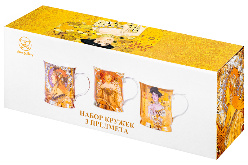 Набор 3 кружек Elan Gallery украшен изображениями по мотивам шедевров мировой живописи и выполнен из фарфора нового поколения new bone china. Благодаря современным технологиям он не уступает другим видам фарфора в прочности, но при этом экологичнее в производстве. В комплект входят кружечки с репродукциями картин знаменитых художников Альфонса Мухи ("Зодиак", "Мечтательность") и Густава Климта ("Золотая Адель"). Размер каждой – 12,5х9х10 см, объём – 400 мл. Они точно вызовут восхищение у ваших близких или гостей! Оригинальный дизайн добавит изысканности любому интерьеру вашей кухни или столовой. Фарфоровая кружка подходит ценителям чая и кофе, которые любят пить из красивой и необычной посуды. Это идеальный вариант для того, чтобы согреться горячим напитком зимой и освежиться прохладным лимонадом летом. Интересный бокал с удобной ручкой украсит ваш стол своим стильным дизайном как на праздник, так и в будни. Используйте каждую под любые напитки, например, как кофейную под капучино или латте. Красивая посуда станет украшением любого стола и незаменимым предметом на чаепитии или чайной церемонии! Из-за золотистого декора чашки нельзя использовать в микроволновой печи и мыть в посудомоечной машине. Станут приятным подарком как для мужчин, так и для женщин. Оригинальная кружка – это сюрприз для ценителей искусства на любой праздник. Поставляются в стильной коробке. Благодаря красочной коробочке вам не придётся искать дополнительную подарочную упаковку! В коллекции бренда Elan Gallery представлено много красивой посуды, кухонного инвентаря, предметов декора и других товаров для дома. Здесь вы найдёте всё для эстетичной сервировки и создания уюта!