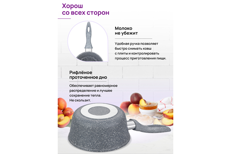 Ковш "Гармония вкуса" объемом 1,2 литра с крышкой равномерно разогревается и распределяет тепло таким образом, что продукты в нем остаются сочными и сохраняют все свои полезные и вкусовые свойства. Ковш выполнен из толстостенного литого алюминия и имеет ультрапрочное двухслойное антипригарное покрытие Cookmark. Покрытие устойчиво к царапинам и износу, полностью безопасно для здоровья и не содержит PFOA или других вредных веществ. Эксплуатация: не нагревать без продуктов. Дайте посуде остыть, прежде чем помещать ее в воду. Использовать только деревянные и силиконовые приборы. Не мыть абразивными или щелочными моющими средствами. Использовать в посудомоечной машине только в режиме "Эко". Подходит для всех типов плит, кроме индукционных.
