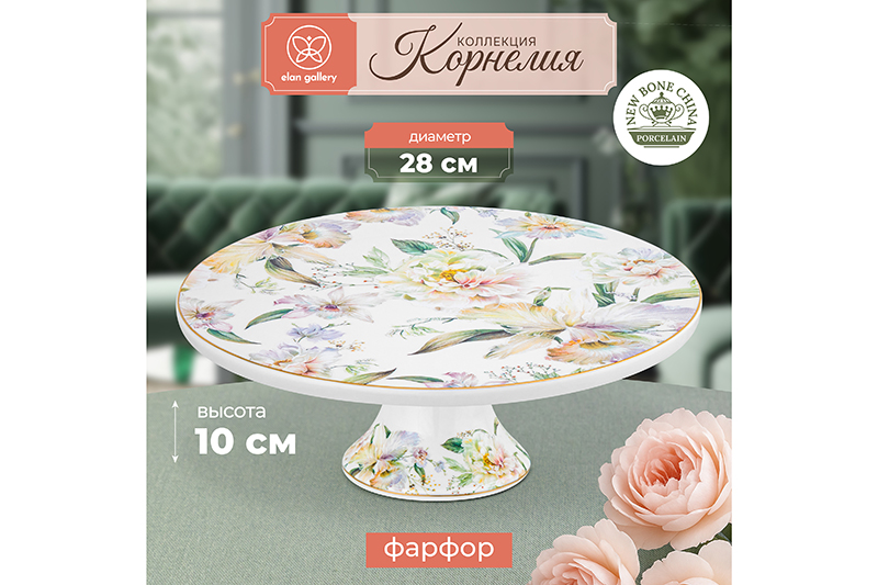 Круглое блюдо на ножке для торта, выпечки и капкейков от Elan Gallery из серии "Корнелия" 28х28х10 см выполнено фарфора нового поколения new bone china. Высота ножки – 9 см. Материал сочетает в себе изящность и высокую прочность. За счёт гладкости изделия легко отмываются, поэтому сохраняют привлекательный внешний вид и практичны в использовании. От костяного фарфора new bone china отличается большей экологичностью в производстве. Поверхность изделия овивают обворожительные белые пионы. Они выполнены в манере, вдохновлённой акварельным рисунком. Тонкая золотистая окантовка служит деликатным акцентом и подчёркивает их изысканность. Тарелка станет гармоничным дополнением вашего стола в будни и на праздник. Используйте сервировочное блюдо для конфет или фруктов. Оно будет смотреться наряднее простой подложки для торта! Декоративная тортовница подойдет для любых десертов, таких как капкейки, печенье и пирожные. Тарелочка незаменима для изящной сервировки домашнего пирога и любых сладостей, а также сыра и мясной нарезки! Вы сможете красиво подать гостям бутерброды, канапе и даже суши и роллы. Используйте тарелку для закусок или в роли фруктовницы на празднике. На Пасху тортница подойдёт для кулича. Фарфор не впитывает цвет продуктов и не деформируется от влаги, чему может быть подвержена керамика. Не рекомендуется применять абразивные моющие средства. Нельзя мыть в посудомоечной машине и использовать в микроволновой печи. Поставляется в стильной картонной коробке. Станет настоящим украшением вашего дома и чудесным подарком на любой праздник. Благодаря красочной коробочке не понадобится дополнительная подарочная упаковка! Серия "Корнелия" от бренда Элан Галерея добавит вашему кухонному инвентарю лёгкости и элегантности, преобразив любую сервировку!
