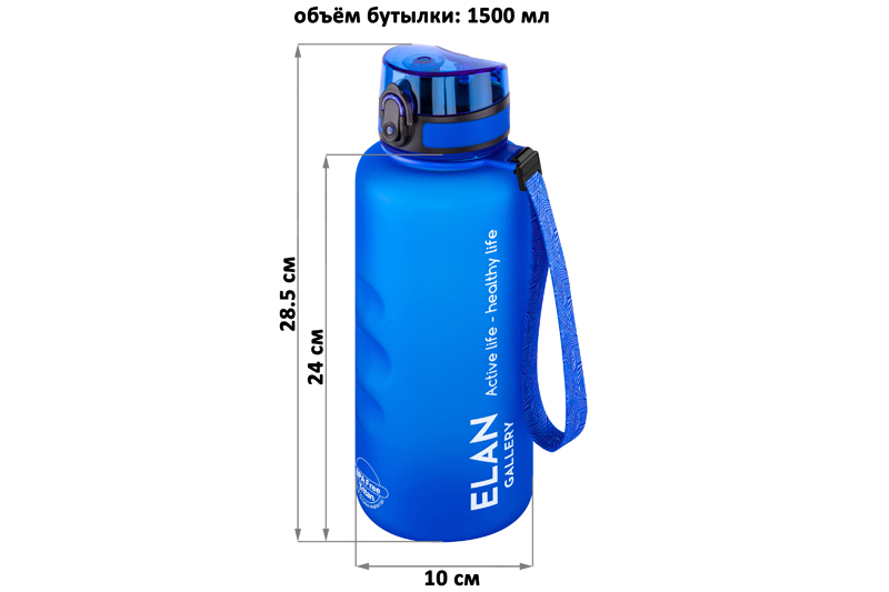 Бутылка для воды «Style Matte» от Elan Gallery – это практичное и стильное решение для ценителей активного образа жизни. Размер ёмкости – 10х10х28,5 см. Высота до крышки – 24 см. Объём – 1,5 литра. Изделие выполнено из тритана – прочного, безопасного материала, не содержащего бисфенол А. Этот пластик не впитывает запахи и не влияет на вкус напитков. Бутылочка подходит как для холодной, так и для горячей жидкости. Освежитесь любимыми летними напитками в жару или согрейтесь ароматным чаем зимой! Матовое покрытие и углубления для пальцев обеспечивают комфортное использование на прогулке, в офисе и на тренировке в зале. Надёжная крышка с герметичным клапаном препятствует проливанию, а встроенное ситечко позволит заваривать напитки с травами и фруктами. С удобным ремешком бутылку можно закрепить на рюкзаке или запястье – это позволяет брать её в путешествия, поездку на велосипеде или автомобиле. Многоразовая дорожная бутылка подходит как для туризма, так и для пикника на природе. Удобная форма делает её не только туристическим, но и спортивным инвентарём. Большая пластиковая ёмкость для питья – прекрасный вариант для занятий фитнесом, йогой или бегом в спортзале или на свежем воздухе. Она также дополнит занятия велоспортом в качестве велосипедного аксессуара. Это надёжный помощник спортсменам во время игры в футбол или волейбол, занятий гимнастикой и танцами. Подходит как для взрослых, так и для школьников – её можно взять в школу и на занятия физкультурой. Благодаря универсальному дизайну и небесному цвету она подойдёт как девочкам, так и мальчикам в качестве школьного аксессуара. Функциональная бутылка в дизайнерской картонной упаковке – это готовый подарок для женщин и мужчин. Не подходит для микроволновой печи, посудомоечной машины и стерилизатора. В коллекции бренда Элан Галерея представлена разнообразная посуда и товары для дома на любой вкус. Спортивные аксессуары из серии «Style Matte» помогут следить за водным балансом, где бы вы ни находились!