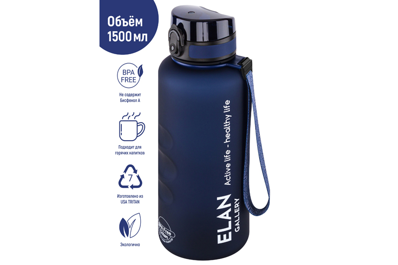 Бутылка для воды «Style Matte» от Elan Gallery – это практичное и стильное решение для ценителей активного образа жизни. Размер ёмкости – 10х10х28,5 см. Высота до крышки – 24 см. Объём – 1,5 литра. Изделие выполнено из тритана – прочного, безопасного материала, не содержащего бисфенол А. Этот пластик не впитывает запахи и не влияет на вкус напитков. Бутылочка подходит как для холодной, так и для горячей жидкости. Освежитесь любимыми летними напитками в жару или согрейтесь ароматным чаем зимой! Матовое покрытие и углубления для пальцев обеспечивают комфортное использование на прогулке, в офисе и на тренировке в зале. Надёжная крышка с герметичным клапаном препятствует проливанию, а встроенное ситечко позволит заваривать напитки с травами и фруктами. С удобным ремешком бутылку можно закрепить на рюкзаке или запястье – это позволяет брать её в путешествия, поездку на велосипеде или автомобиле. Многоразовая дорожная бутылка подходит как для туризма, так и для пикника на природе. Удобная форма делает её не только туристическим, но и спортивным инвентарём. Большая пластиковая ёмкость для питья – прекрасный вариант для занятий фитнесом, йогой или бегом в спортзале или на свежем воздухе. Она также дополнит занятия велоспортом в качестве велосипедного аксессуара. Это надёжный помощник спортсменам во время игры в футбол или волейбол, занятий гимнастикой и танцами. Подходит как для взрослых, так и для школьников – её можно взять в школу и на занятия физкультурой. Благодаря универсальному дизайну и тёмно-синему цвету она подойдёт как девочкам, так и мальчикам в качестве школьного аксессуара. Функциональная бутылка в дизайнерской картонной упаковке – это готовый подарок для женщин и мужчин. Не подходит для микроволновой печи, посудомоечной машины и стерилизатора. В коллекции бренда Элан Галерея представлена разнообразная посуда и товары для дома на любой вкус. Спортивные аксессуары из серии «Style Matte» помогут следить за водным балансом, где бы вы ни находились!