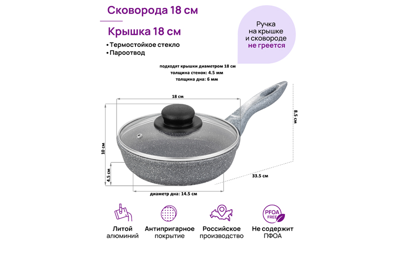 Сковорода глубокая "Гармония вкуса" 18 см с крышкой равномерно разогревается и распределяет тепло таким образом, что продукты в ней остаются сочными и сохраняют все свои полезные и вкусовые свойства. Сковорода выполнена из толстостенного литого алюминия и имеет ультрапрочное двухслойное антипригарное покрытие Cookmark. Покрытие устойчиво к царапинам и износу, полностью безопасно для здоровья и не содержит PFOA или других вредных веществ. Эксплуатация: не нагревать без продуктов. Дайте посуде остыть, прежде чем помещать ее в воду. Использовать только деревянные и силиконовые лопатки. Не мыть абразивными или щелочными моющими средствами. Использовать в посудомоечной машине только в режиме "Эко". Подходит для всех типов плит, кроме индукционных.