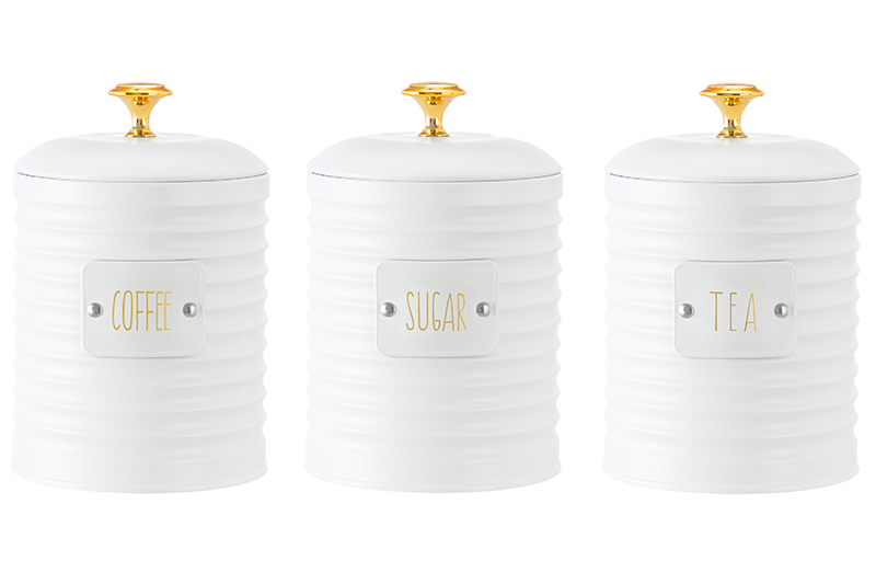 Набор 3 банок от Elan Gallery предназначен для организации системы хранения продуктов на вашей кухне. Размер каждой ёмкости – 10,5х10,5х16 см, объём – 1 литр. Белые изделия выполнены из металла с пудровым покрытием. На их рельефные стенки нанесены плашки с золотыми надписями: «coffee» («кофе»), «sugar» («сахар»), «tea» («чай»). Крышки оснащены пластиковыми ручками, окрашенными в золотистый цвет, и силиконовыми уплотнителями. Используйте органайзеры для хранения разнообразных сыпучих продуктов: чая и кофе, сахара и соли, специй и приправ, круп и макаронных изделий. Заполните баночки сухофруктами, печеньем, конфетами и другими поштучными сладостями. Ёмкости не впитывают запахи, а герметичные крышки защитят продукты от влаги и пыли. Стильные контейнеры станут не только функциональным, но и эстетичным дополнением вашей кухни. Их лаконичный дизайн впишется в интерьер любой столовой. Не рекомендуется применять абразивные моющие средства. Не подходят для использования в посудомоечной машине и микроволновой печи. Поставляются в дизайнерской картонной коробке – благодаря ей вам не потребуется дополнительная подарочная упаковка. Набор от бренда Элан Галерея поможет вам привнести эстетику в свой кухонный инвентарь и организовать удобное хранение продуктов!