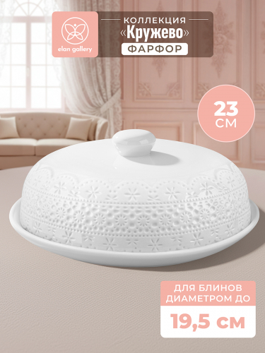 Блинница с крышкой из серии «Кружево» от Elan Gallery предназначена для эстетичной сервировки вашего стола. Размер изделия – 23х23х9,5 см, высота блюда без крышки – 1,7 см. Внутренний диаметр под крышкой – 19 см. Выполнена из высококачественного белого фарфора. Он не впитывает цвет продуктов и легко отмывается, благодаря чему надолго сохраняет свою белизну. Поверхность украшена рельефным кружевным узором. Изделие подойдёт не только для хранения блинчиков и оладий, но и для подачи печенья, кусочков торта или пирога. Под крышкой блины долго не остынут и сохранят свой изначальный вид и вкус. Изделие также подойдёт для сервировки сырной и мясной нарезки, бутербродов, шашлыка и кусочков пиццы. Эстетично преподнесите на ней фрукты, десерты и другие праздничные закуски. Благодаря нежному дизайну изделие гармонично впишется в интерьер любой кухни, столовой или гостиной. Не рекомендуется применять абразивные моющие средства. Подходит для использования в посудомоечной машине и микроволновой печи. Поставляется в дизайнерской картонной коробке – благодаря ей вам не потребуется дополнительная подарочная упаковка. Фарфоровая сервировочная посуда будет оригинальным подарком для хозяйки, ценящей не только практичность, но и привлекательность. Серия «Кружево» от бренда Элан Галерея станет украшением любого кухонного инвентаря и позволит собрать красивый сервиз в едином стиле!