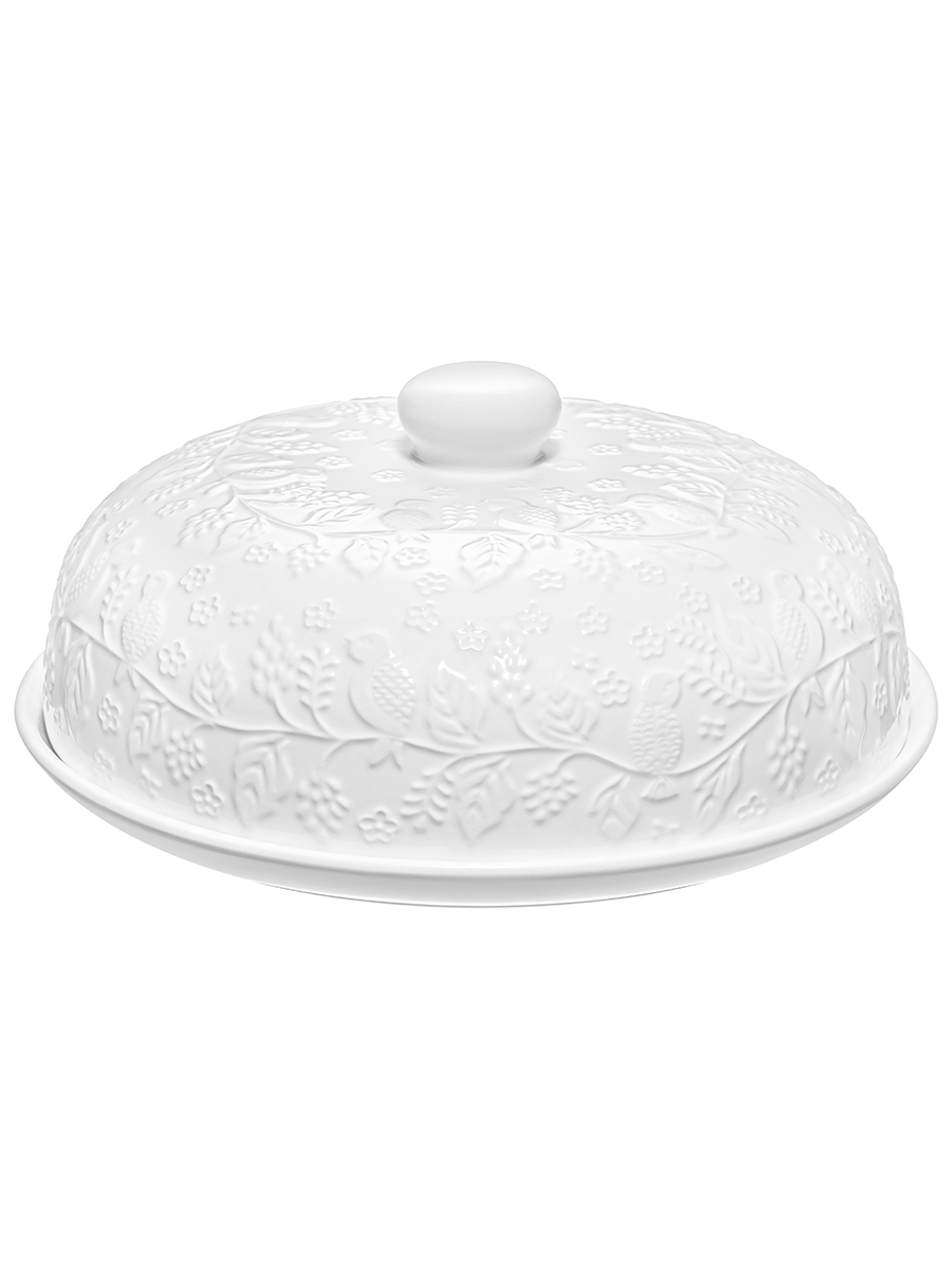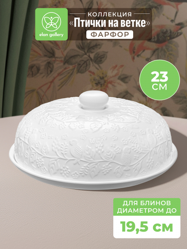 Блинница с крышкой Elan Gallery "Птички на ветке" размером 23х23х9,5 см выполнена из белого фарфора и украшена изящным рельефным узором. Высота без крышки 1,5 см. Можно использовать не только для хранения блинчиков и оладий, но и подачи печенья, кусочков торта и пирога. Под крышкой блины долго не остынут и сохранят свой первозданный вид и вкус. Блинница эстетично смотрится на столе и подойдёт для сервировки нарезки, бутербродов и выпечки. Блюдо с крышкой можно использовать для подачи сыра, шашлыка, пиццы, а также фруктов, десерта и разноса любых закусок на празднике. Фарфоровая посуда отличается от керамической повышенной плотностью. Фарфор не впитывает цвет продуктов и не деформируется от влаги, чему может быть подвержена керамика. Не рекомендуется применять абразивные моющие средства. Тарелку с крышкой можно использовать в посудомоечной машине и микроволновой печи. Поставляется в стильной картонной упаковке. Красивый кухонный инвентарь – отличный подарок для любой хозяйки! Сервировочное блюдо станет украшением вашего стола как на праздник, так и в будни и поможет сохранить тепло и аромат продуктов.