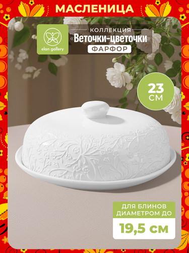 Блинница с крышкой из серии «Веточки-цветочки» от Elan Gallery предназначена для эстетичной сервировки вашего стола. Размер изделия – 23х23х9,5 см, высота без крышки – 1,5 см. Подходит для блинов диаметром 19,5 см. Выполнена из высококачественного белого фарфора. Он не впитывает цвет продуктов и легко отмывается, благодаря чему надолго сохраняет свою белизну. Поверхность изделия украшают рельефные узоры в виде лиственных веточек с аккуратными цветочными бутончиками. Изделие подойдёт не только для хранения блинчиков и оладий, но и для подачи печенья, кусочков торта и пирога. Под крышкой блины долго не остынут. Поможет отпраздновать Широкую Масленицу со вкусом! Масленица – это чудесный повод собраться за праздничным столом и насладиться тёплой атмосферой и традиционной русской кухней. Изделие также подойдёт для сервировки сырной и мясной нарезки, бутербродов, шашлыка и кусочков пиццы. Эстетично преподнесите на ней фрукты, десерты и другие праздничные закуски. Благодаря лаконичному дизайну она гармонично впишется в интерьер любой кухни, столовой и гостиной. Не рекомендуется применять абразивные моющие средства. Подходит для использования в посудомоечной машине и микроволновой печи. Поставляется в дизайнерской картонной коробке – благодаря ей вам не потребуется дополнительная подарочная упаковка. Фарфоровая сервировочная посуда будет оригинальным подарком для хозяйки, ценящей не только практичность, но и привлекательность. В ассортименте бренда Elan Gallery вы найдёте предметы декора и красивую посуду для приготовления и сервировки масленичных блюд. Пусть Масленичная неделя принесет вам радость и множество вкусных моментов!