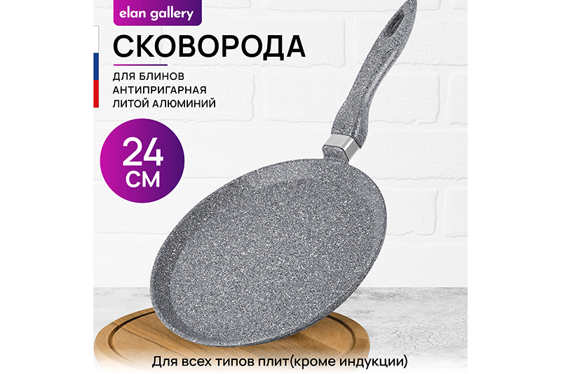 Сковорода блинная Elan Gallery "Гармония вкуса" в оттенке "Серый мрамор" диаметром 24 см равномерно разогревается и распределяет тепло таким образом, чтобы продукты сохраняли все свои полезные и вкусовые свойства. Сковорода изготовлена из литого алюминия и имеет ультрапрочное двухслойное антипригарное покрытие Cookmark. Оно защищает блинчики от пригорания и позволяет переворачивать их лопаткой без особого труда. Выполнена в стильном дизайне. Покрытие устойчиво к царапинам и износу, полностью безопасно для здоровья и не содержит PFOA или других вредных веществ. Готовьте блины идеальной формы на завтрак и радуйте ими своих близких! Эксплуатация: не нагревать без продуктов. Дайте посуде остыть, прежде чем помещать ее в воду. Использовать только деревянные и силиконовые приборы. Не мыть абразивными или щелочными моющими средствами. Использовать в посудомоечной машине только в режиме "Эко" с применением средств, не содержащих щелочи. Подходит для всех типов плит, кроме индукционных. Блинница станет идеальным подарком для женщин и придаст процессу приготовления пищи новый уровень комфорта. Подарите универсальную кухонную утварь вещь маме, подруге, сестре или тёте. Хорошая блинная сковородка – мечта любой хозяйки! В серии "Гармония вкуса" вы найдёте любые кухонные принадлежности и инвентарь для вашего дома. Соберите набор для вашей кухни в едином стиле!
