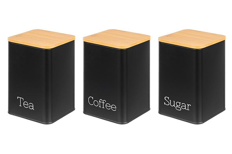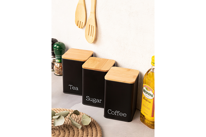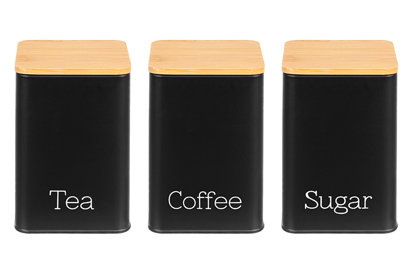 БЫЛО 1720 руб! Набор банок д/сыпучих продуктов 3 пр. 1,1 л 9,5*9,5*14,5 см "Tea, coffee, sugar" черный с бамб.крыш