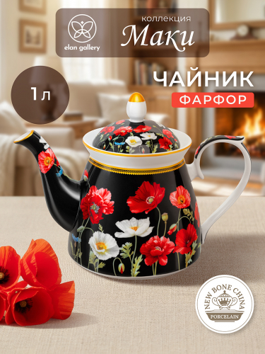 БЫЛО 1721 руб!! Чайник 1 л 23*13*17 см "Маки на черном" NEW BONE CHINA