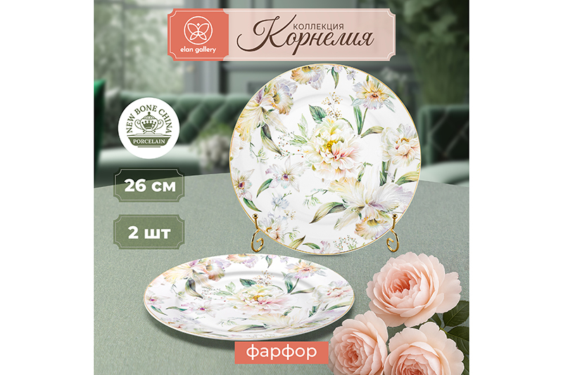 Набор 2 тарелок из серии "Корнелия" от Elan Gallery предназначен для эстетичной сервировки вашего стола. Размер каждого изделия – 26,5х26,5х2 см. Посуда выполнена из фарфора нового поколения new bone china, сочетающего в себе изящность и высокую прочность. За счёт гладкости изделия легко отмываются, поэтому сохраняют привлекательный внешний вид и практичны в использовании. Плотная структура материала позволяет посуде дольше сохранять температуру блюд. От костяного фарфора new bone china отличается большей экологичностью в производстве. Поверхность изделия овивают обворожительные белые пионы. Они выполнены в манере, вдохновлённой акварельным рисунком. Тонкая золотистая окантовка служит деликатным акцентом и подчёркивает их изысканность. Сервировочный набор отлично подойдёт для подачи вторых блюд, закусок и салатов. Заполните их пастой и деликатесами из рыбы, красиво выложите нарезку из свежих овощей и фруктов, сыров и яиц. Положите роллы и суши для вкусного перекуса. Блюда помогут преподнести разнообразные десерты, сладости и выпечку. Разложите конфеты, разместите по кусочку торта на дружеском или семейном чаепитии. Элегантные тарелочки украсят интерьер кухни или столовой. Не рекомендуется применять абразивные моющие средства. Нельзя использовать в посудомоечной машине и микроволновой печи. Поставляются в дизайнерской картонной коробке – благодаря ей вам не потребуется дополнительная подарочная упаковка. Фарфоровая сервировочная посуда станет оригинальным подарком на любой праздник для тех, кто ценит сочетание практичности и привлекательности. Серия "Корнелия" от бренда Элан Галерея добавит вашему кухонному инвентарю лёгкости и элегантности, преобразив любую сервировку!