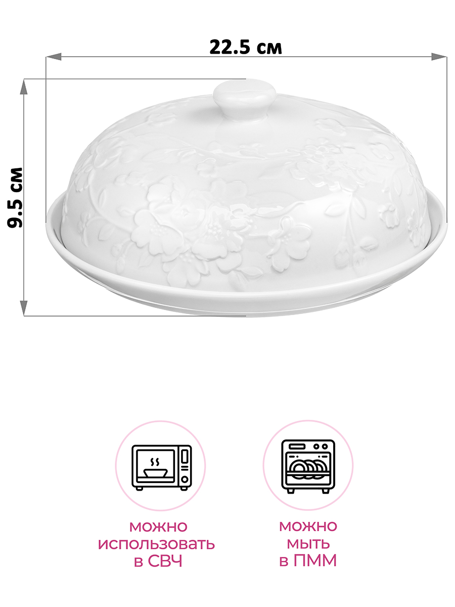 Блинница с крышкой Elan Gallery "Цветущая сакура" размером 22,5х22,5х9,5 см выполнена из белого фарфора, украшена рельефным узором. Внутренний диаметр тарелки под крышкой 19 см. Внутренний диаметр крышки-купола 19,5 см. Высота тарелки без крышки 2 см. Поможет отпраздновать Широкую Масленицу со вкусом! Масленица – это чудесный повод собраться за праздничным столом и насладиться тёплой атмосферой и традиционной русской кухней. В ассортименте бренда Elan Gallery вы найдёте предметы декора и красивую посуду для приготовления и сервировки масленичных блюд. Пусть Масленичная неделя принесет вам радость и множество вкусных моментов! Тарелочку можно использовать не только для хранения блинчиков и оладий, но и подачи печенья, кусочков торта и пирога. Под крышкой блины долго не остынут и сохранят свой первозданный вид и вкус. Блинница эстетично смотрится на столе и подойдёт для сервировки нарезки, бутербродов и выпечки. Блюдо с крышкой можно использовать для подачи сыра, шашлыка, пиццы, а также фруктов, десерта и разноса любых закусок на празднике. Фарфоровая посуда отличается от керамической повышенной плотностью. Фарфор не впитывает цвет продуктов и не деформируется от влаги, чему может быть подвержена керамика. Не рекомендуется применять абразивные моющие средства. Можно использовать в посудомоечной машине и микроволновой печи. Посуда поставляется в стильной картонной коробке. Красивый кухонный инвентарь – отличный подарок на любой праздник! Благодаря красочной коробочке не понадобится подарочная упаковка, если вы решите сделать сюрприз своим близким. Сервировочное блюдо станет украшением вашего стола как на праздник, так и в будни и поможет сохранить тепло и аромат продуктов.