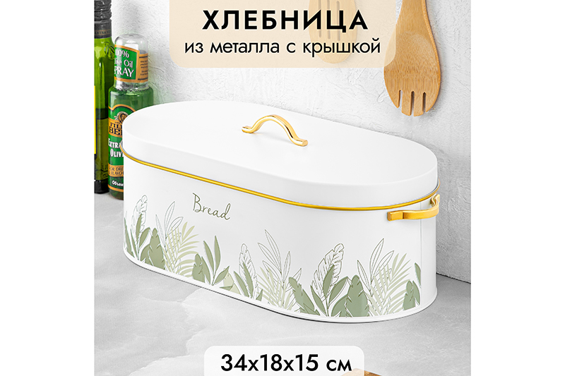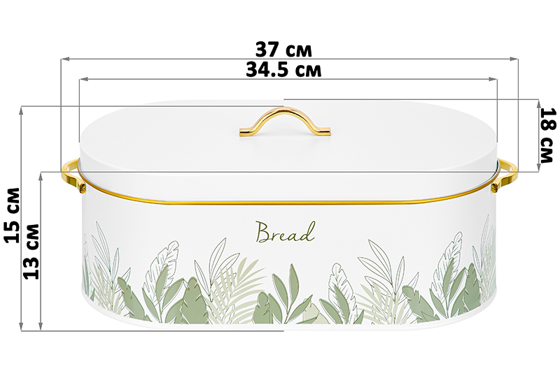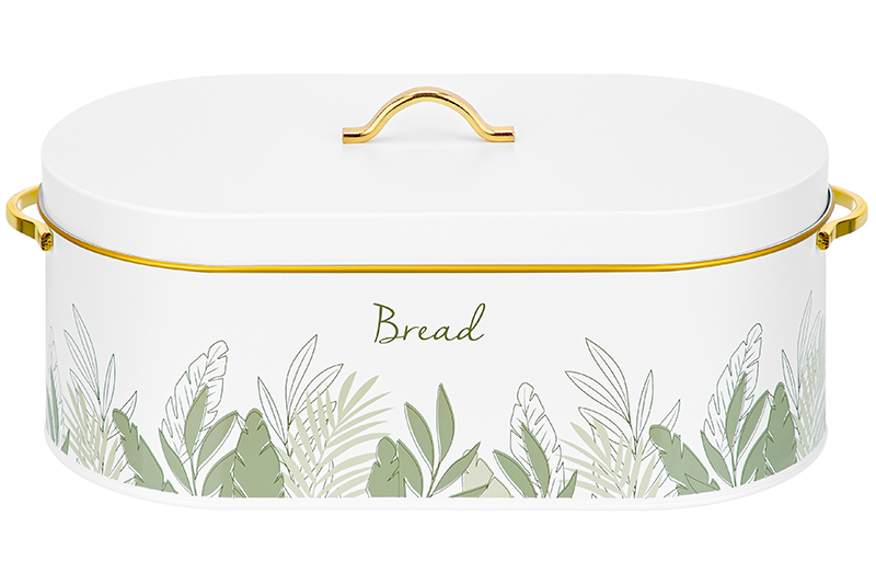 Хлебница от бренда Elan Gallery "Bread" белого цвета предназначена для эстетичного и компактного хранения продуктов на вашей кухне. Контейнер выполнен из металла с пудровым покрытием, имеет две золотистые ручки по бокам и одну ручку на крышке. Высота без крышки 13 см, размер контейнера 34,5х18х15 см, общий размер хлебницы с ручками 37х18х15 см. Стеночка металлического изделия украшена надписью "Bread" ("Хлеб") и красивым рисунком с листьями в белых и зелёных оттенках. Металлическая ёмкость не впитывает запахи, держит температуру, предотвращает попадание влаги. Плотно прилегающая крышка надёжно защитит булочки от внешних воздействий, сохранив их привлекательный вид. Благодаря стильному дизайну настольный органайзер станет украшением интерьера вашей кухни или столовой. Удобные ручки золотого цвета позволят легко переносить хлебницу, поэтому она подойдёт для сервировки стола. Большую ёмкость овальной формы можно приспособить не только под хлеб и выпечку, но и для хранения пакетов с печеньем, конфетами и другими сладостями. В большой ящичек уместятся даже гриссини, хлебные палочки и большое количество сухарей. Не рекомендуется применять абразивные моющие средства. Металлический ящик нельзя использовать в посудомоечной машине. Поставляется в стильной картонной коробке. Благодаря красочной коробочке не понадобится подарочная упаковка, если вы решите сделать сюрприз своим близким. Красивая хлебница станет отличным подарком и функциональным элементом декора. Она поможет навести в доме порядок и создать атмосферу уюта, а также сохранит форму и аппетитный вид хлебобулочных изделий. В коллекции бренда Элан Галерея представлено много красивой посуды, кухонных аксессуаров, столового инвентаря и других функциональных товаров для дома. Выберите варианты на свой вкус!