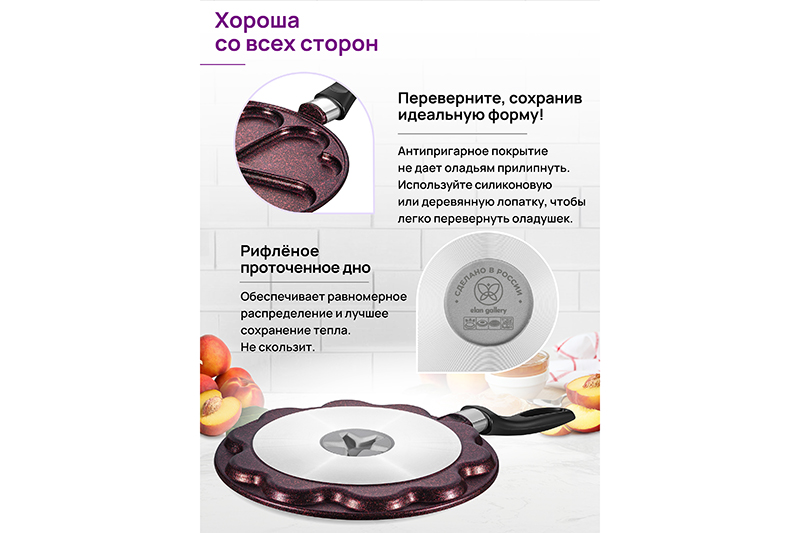Сковорода оладница Elan Gallery "Гранат" из серии "Гармония вкуса" диаметром 26 см имеет отсеки, благодаря которым продукты будут иметь ровную и красивую форму сердечек. Глубина ячеек 1 см. За счёт фигурных секций не понадобятся специальное приспособление или формочка, чтобы придать блюду фигурную форму. Сковородка универсальная: подойдет для жарки блинчиков, оладий или порционной яичницы. Оладница поможет быстро приготовить на завтрак оладушки, панкейки и блюда из яиц. Можно использовать для эстетичной сервировки стола. Блинная сковорода выполнена из литого алюминия, имеет высококачественное антипригарное покрытие Cookmark. Блинница украшена рисунком, напоминающим гранитную крошку. Ручка выполнена из жаропрочного бакелита и не нагревается при приготовлении (не рассчитана на прямой контакт с огнем). Алюминиевая блинница быстро разогревается: не греть без продуктов. Подходит для газовых, электрических, стеклокерамических плит. Не для индукции. Использовать только деревянные или силиконовые кухонные принадлежности и лопатки. Использовать в посудомоечной машине только в режиме "Эко" с применением средств, не содержащих щелочи. Сковорода станет полезным подарком на праздник и придаст процессу приготовления пищи новый уровень комфорта. В серии "Гармония вкуса" вы найдёте любой кухонный инвентарь для вашего дома. Соберите набор посуды для вашей кухни в едином стиле!