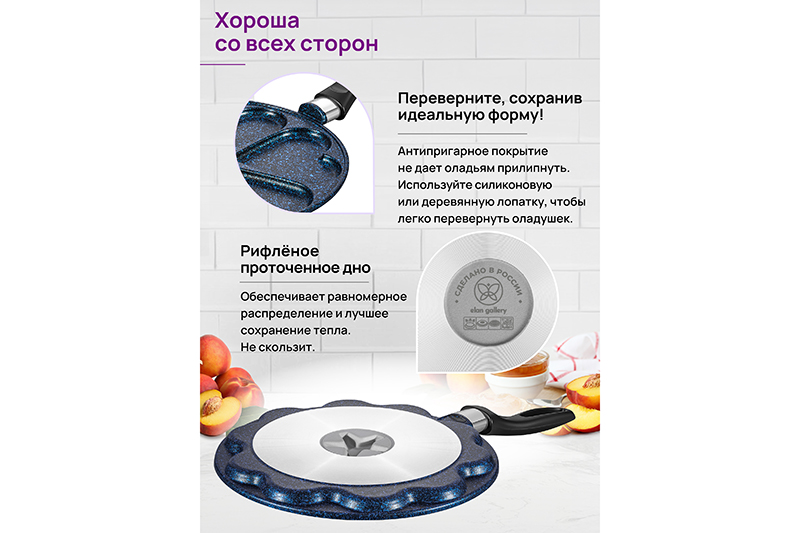 Сковорода оладница Elan Gallery "Сапфир" из серии "Гармония вкуса" диаметром 26 см имеет отсеки, благодаря которым продукты будут иметь ровную и красивую форму сердечек. Глубина ячеек 1 см. За счёт фигурных секций не понадобятся специальное приспособление или формочка, чтобы придать блюду фигурную форму. Сковородка универсальная: подойдет для жарки блинчиков, оладий или порционной яичницы. Оладница поможет быстро приготовить на завтрак оладушки, панкейки и блюда из яиц. Можно использовать для эстетичной сервировки стола. Блинная сковорода выполнена из литого алюминия, имеет высококачественное антипригарное покрытие Cookmark. Блинница украшена рисунком, напоминающим гранитную крошку. Ручка выполнена из жаропрочного бакелита и не нагревается при приготовлении (не рассчитана на прямой контакт с огнем). Алюминиевая блинница быстро разогревается: не греть без продуктов. Подходит для газовых, электрических, стеклокерамических плит. Не для индукции. Использовать только деревянные или силиконовые кухонные принадлежности и лопатки. Использовать в посудомоечной машине только в режиме "Эко" с применением средств, не содержащих щелочи. Сковорода станет полезным подарком на праздник и придаст процессу приготовления пищи новый уровень комфорта. В серии "Гармония вкуса" вы найдёте любой кухонный инвентарь для вашего дома. Соберите набор посуды для вашей кухни в едином стиле!