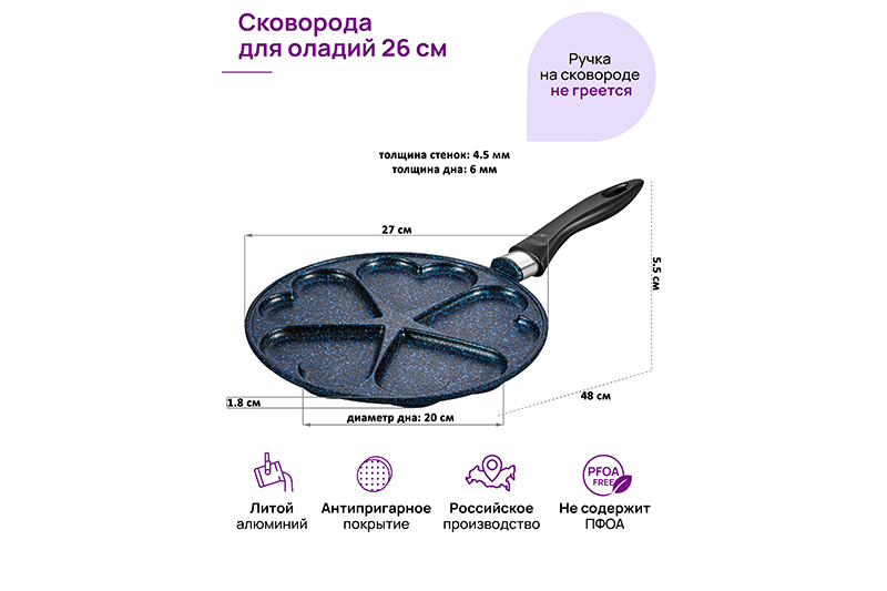 БЫЛО 1854 руб! Сковорода для оладий 26 см ГАРМОНИЯ ВКУСА "Сапфир" сердце н/р, 48*27*5,5 см.