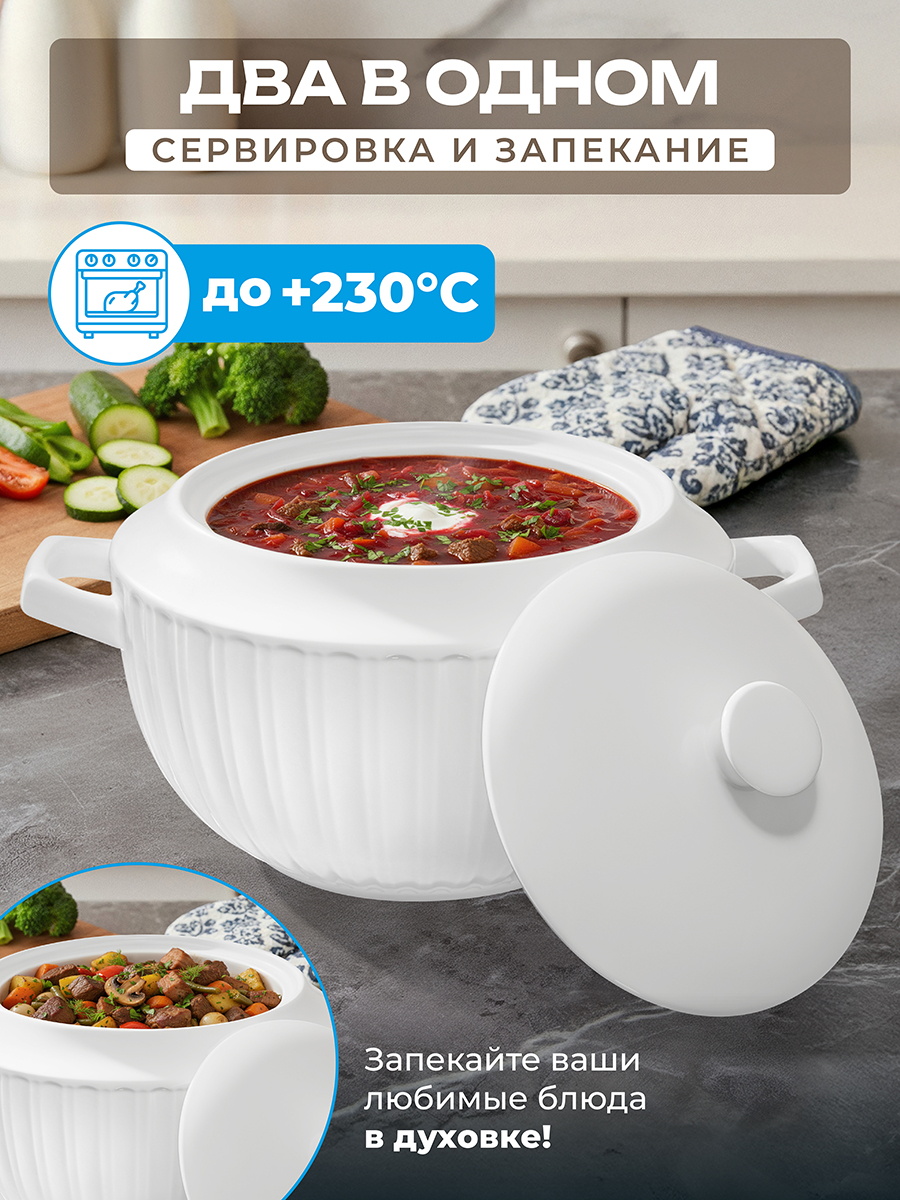 Супница с крышкой из серии «Ампир» от Elan Gallery предназначена для эстетичной сервировки вашего стола. Размер изделия – 26х20,5х17 см, объём – 2,5 литра. Размер дна – 12х12 см. Выполнена из высококачественного белого фарфора. Он не впитывает цвет продуктов и легко отмывается, благодаря чему надолго сохраняет свою белизну. Поверхность изделия украшает элегантный ребристый рельеф. Глубокая ёмкость поможет эстетично подавать аппетитные борщи, ароматные щи, домашние пельмени и другие блюда! Фигурная супница хорошо сохраняет тепло блюд благодаря крышке, а за счёт ручек удобна для переноски. Летом суповая чаша подойдёт для красивой подачи окрошки – в роли окрошницы, а также позволит наслаждаться горячим супом круглый год. Подайте к столу лапшу, вареники или классический куриный бульон. Благодаря изящному дизайну подойдёт для сервировки праздничного стола – угостите своих гостей ароматным пловом. Не рекомендуется применять абразивные моющие средства. Подходит для использования в посудомоечной машине, микроволновой печи и духовом шкафу при температуре до 230 градусов. Поставляется в дизайнерской картонной коробке – благодаря ей вам не потребуется дополнительная подарочная упаковка. Фарфоровая сервировочная посуда будет оригинальным подарком для хозяйки, ценящей не только практичность, но и привлекательность. Серия «Ампир» от бренда Элан Галерея станет украшением любого кухонного инвентаря и позволит собрать красивый сервиз в едином стиле!