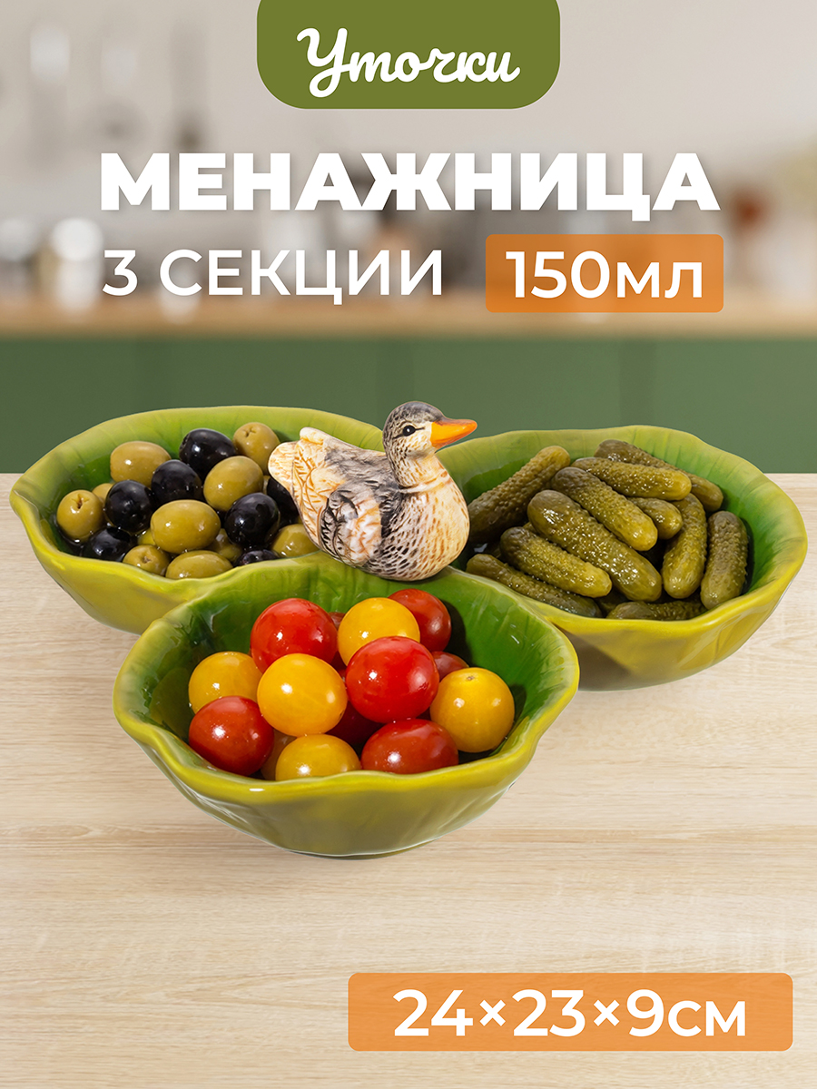 Менажница на 3 секции «Уточка» от Elan Gallery предназначена для эстетичной сервировки вашего стола. Общий размер изделия – 24х23х9 см. Размер каждой секции – 12х12х4 см, объём каждой секции – 150 мл. Выполнена из керамики в виде трёх зелёных листов, на которых сидит маленькая уточка. Фигурка не снимается! Менажница позволит красиво подавать маслины, орехи или сыры. Она станет незаменимым элементом праздничных обедов или неторопливых завтраков. Послужит в качестве конфетницы, позволяя угостить себя и гостей любимыми сладостями: конфетами, мармеладом, леденцами или безе. Подайте к столу ассорти из любимых закусок! Не рекомендуется применять абразивные моющие средства. Не подходит для использования в посудомоечной машине и микроволновой печи. Поставляется в дизайнерской картонной коробке – благодаря ей вам не потребуется дополнительная подарочная упаковка. В коллекции бренда Элан Галерея представлен богатый выбор декоративной посуды и красивых сувениров – каждый обязательно подберёт вариант на свой вкус. Они станут оригинальным подарком для родных, близких и коллег. Преобразите пространство вокруг себя, наполнив его неповторимым очарованием!