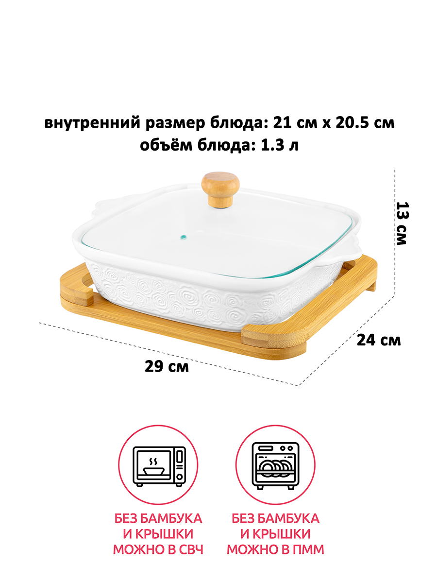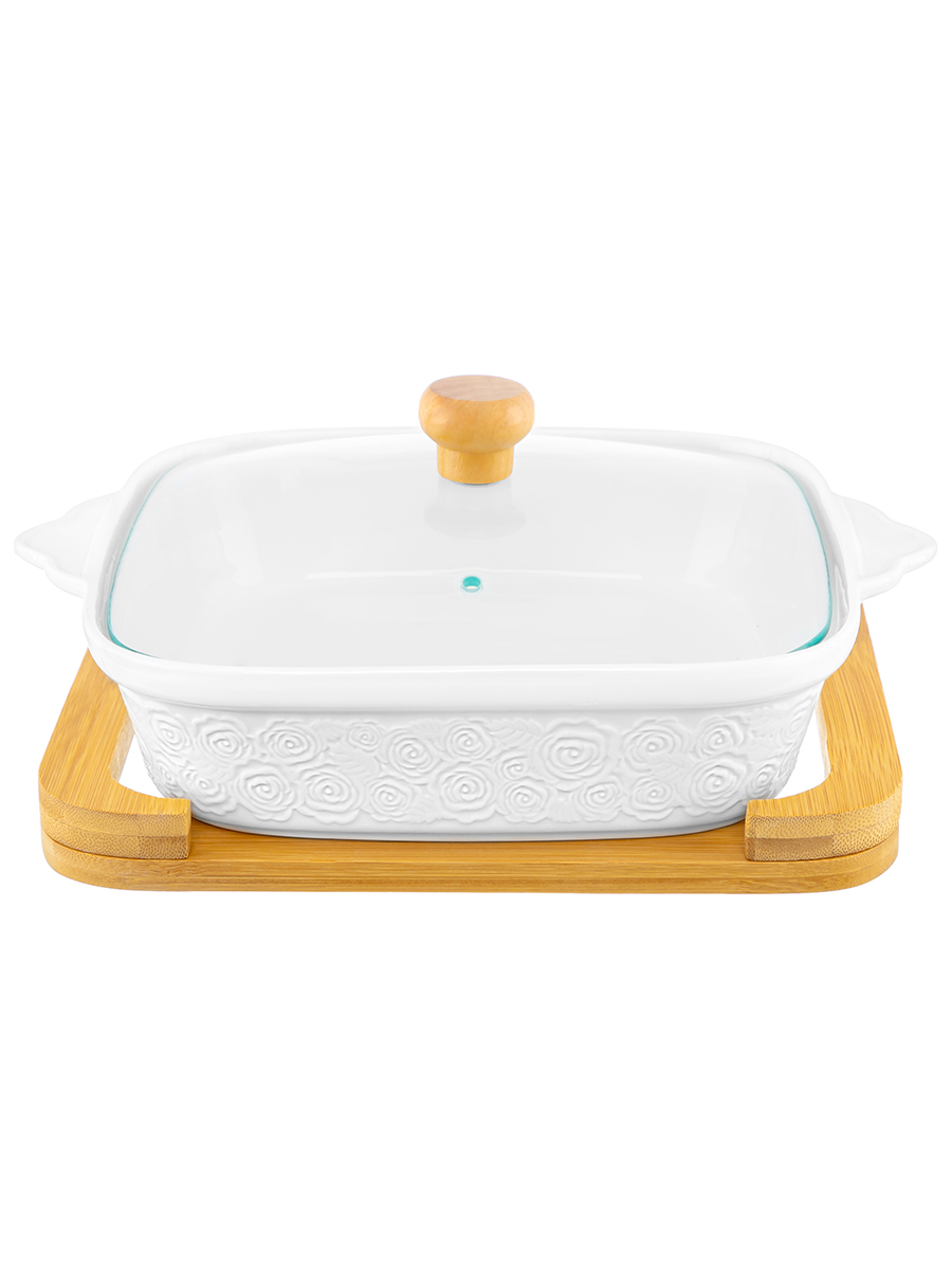 БЫЛО 2008 руб!! Блюдо д/запекания и сервировки 1,3 л 29*24*13 см "Розы" квадрат. со стекл. крышкой на дер. подставке