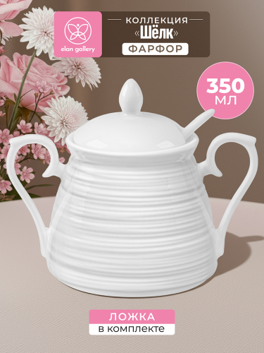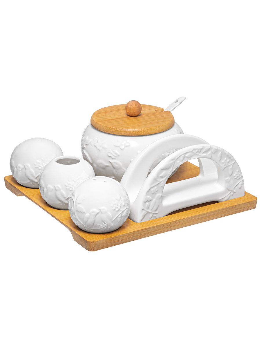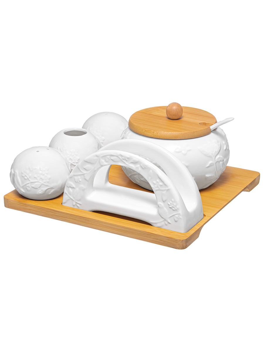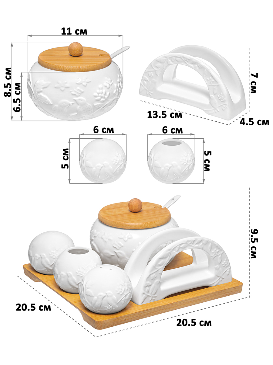 Набор посуды на бамбуковой подставке из серии «Птички на ветке» от бренда Elan Gallery предназначен для эстетичной сервировки вашего стола. Включает сахарницу с ложкой, набор для специй, вазочку для зубочисток и салфетницу. Размер комплекта – 20,5х19,5х9,5 см. Подставка и крышка сахарницы выполнены из натурального бамбука. Посуда выполнена из высококачественного белого фарфора. Он не впитывает цвет продуктов и легко отмывается, благодаря чему надолго сохранит свою белизну. Поверхность изделий украшает рельефный рисунок в виде лиственных веточек, на которых сидят птички. Размер сахарницы – 11х11х8,5 см, объём – 310 мл. Подойдёт для сахара, соли и других сыпучих продуктов. Подайте её вместе с горячими блюдами, чтобы каждый мог приправить пищу по своему вкусу. Приспособьте под варенье, мёд или икру. Ложечка позволит удобно набрать необходимое количество продуктов и компактно помещается в баночке благодаря выемке на крышке. Размер каждой маленькой ёмкости – 6х6х5 см, объём – 75 мл. Набор для специй позволит держать под рукой необходимые приправы. Наполняются через отверстие снизу и закрываются пластиковой пробкой. Вазочка для зубочисток станет удобной гигиеничной принадлежностью. Зубочистки не входят в комплект. Размер салфетницы – 13,5х4,5х7 см. Она послужит для компактного хранения салфеток и бумажных полотенец. Не рекомендуется применять абразивные моющие средства. Фарфоровые ёмкости подходят для использования в посудомоечной машине и микроволновой печи. Бамбук нельзя замачивать! Поставляются в дизайнерской картонной коробке – благодаря ей вам не потребуется дополнительная подарочная упаковка. Фарфоровая сервировочная посуда будет оригинальным подарком для хозяйки, ценящей не только практичность, но и привлекательность. Серия «Птички на ветке» от бренда Элан Галерея станет украшением любого кухонного инвентаря и позволит собрать красивый сервиз в едином стиле!