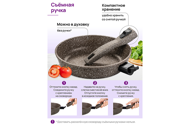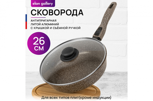 Глубокая сковорода Elan Gallery "Коричневый опал" с крышкой и съёмной ручкой из серии "Гармония вкуса" диаметром 20 см равномерно разогревается и распределяет тепло, поэтому продукты в ней сохраняют полезные свойства и сочность. Диаметр дна — 16,5 см. Стильный дизайн подойдет к любому интерьеру кухни. Подходит для приготовления стейков из рыбы, мяса или блюд из овощей. Сковорода с глубоким дном выполнена из толстостенного литого алюминия и имеет ультрапрочное двухслойное антипригарное покрытие Cookmark. Оно устойчиво к царапинам и износу, безопасно для здоровья и не содержит PFOA или других вредных веществ. Используйте для жарки котлет или картофеля с минимальным количеством масла. Здоровую пищу оценит любой гурман! Готовьте на завтрак оладьи или блюда из яиц: яичницу, омлет. Порадуйте близких большой порцией блинов на Масленицу, ни один блинчик не подгорит. Алюминиевая сковородка с толстым дном имеет удобную ручку, которая обеспечивает надежный захват при подаче еды с плиты на стол. Без крышки и ручки можно использовать в духовом шкафу как форму для запекания при температуре до 250°C. Не использовать съёмную ручку, чтобы достать раскалённую сковороду из духовой печи! Приготовьте румяную курочку в духовке и порадуйте своих близких. Эксплуатация: не нагревать без продуктов. Дайте посуде остыть, прежде чем помещать ее в воду. Использовать только деревянные, силиконовые и пластиковые лопатки без острых краёв. Не мыть абразивными или щелочными моющими средствами. Использовать в ПММ в режиме "Эко" со средством, не содержащим щёлочи. Подходит для стеклокерамических, газовых и электрических плит. Не подходит для индукционных плит. Кухонная утварь станет приятным подарком для женщин на День Рождения, 8 Марта и придаст процессу приготовления пищи комфорта. Подарите универсальную вещь маме, подруге, сестре или бабушке. Хорошая сковорода – мечта любой хозяйки! Сковородка станет незаменимым инвентарем на вашей кухне и наполнит процесс приготовления пищи удовольствием!