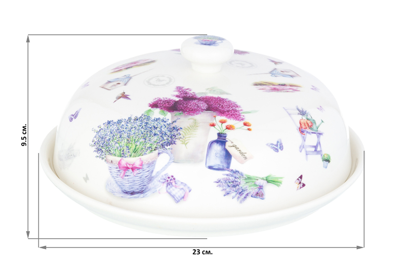 Блинница с крышкой Elan Gallery "Лаванда" размером 23х23х9,5 см выполнена из фарфора new bone china. Внутренний диаметр тарелки под крышкой 18,7 см. Высота без крышки 2 см. New bone china сочетает в себе изящность и высокую прочность. От других видов костяного фарфора материал отличается большей экологичностью в производстве. Серия "Лаванда" украшена нежным принтом на тему Прованса – французской провинции, которая славится своими лавандовыми полями и красивыми пейзажами. Изображение пышных букетов лаванды и гортензии позволит окунуться в атмосферу тепла, гармонии и южного солнца, не покидая вашей кухни или столовой! Можно использовать не только для хранения блинчиков и оладий, но и подачи печенья, кусочков торта и пирога. Под крышкой блины долго не остынут и сохранят свой первозданный вид и вкус. Блинница эстетично смотрится на столе и подойдёт для сервировки нарезки, бутербродов и выпечки. Блюдо с крышкой можно использовать для подачи сыра, шашлыка, пиццы, а также фруктов, десерта и разноса любых закусок на празднике. Фарфоровая посуда отличается от керамической повышенной плотностью. Фарфор не впитывает цвет продуктов и не деформируется от влаги, чему может быть подвержена керамика. Не рекомендуется применять абразивные моющие средства. Тарелку можно использовать в посудомоечной машине и микроволновой печи. Поставляется в стильной картонной коробке. Красивый кухонный инвентарь – отличный подарок на любой праздник! Благодаря красочной коробочке не понадобится подарочная упаковка, если вы решите сделать сюрприз своим близким. Сервировочное блюдо станет украшением вашего стола как на праздник, так и в будни и поможет сохранить тепло и аромат продуктов.