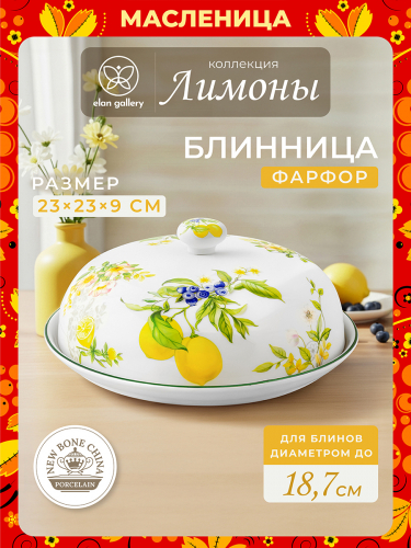 Блинница с крышкой Elan Gallery "Лимоны" размером 23х23х9,5 см выполнена из белого фарфора нового поколения new bone china и украшена красочным рисунком с фруктами и ягодами. Внутренний диаметр тарелки под крышкой 18,7 см. Высота без крышки 2 см. Поможет отпраздновать Широкую Масленицу со вкусом! Масленица – это чудесный повод собраться за праздничным столом и насладиться тёплой атмосферой и традиционной русской кухней. В ассортименте бренда Elan Gallery вы найдёте предметы декора и красивую посуду для приготовления и сервировки масленичных блюд. Пусть Масленичная неделя принесет вам радость и множество вкусных моментов! Можно использовать не только для хранения блинчиков и оладий, но и подачи печенья, кусочков торта и пирога. Фарфор new bone china сочетает в себе изящность и высокую прочность. Плотная структура материала позволяет посуде дольше сохранять температуру блюд и напитков. От других видов костяного фарфора new bone china отличается большей экологичностью в производстве. Под крышкой блины долго не остынут и сохранят свой первозданный вид и вкус. Блинница эстетично смотрится на столе и подойдёт для сервировки нарезки, бутербродов и выпечки. Блюдо с крышкой можно использовать для подачи сыра, шашлыка, пиццы, а также фруктов, десерта и разноса любых закусок на празднике. Фарфоровая посуда отличается от керамической повышенной плотностью. Фарфор не впитывает цвет продуктов и не деформируется от влаги, чему может быть подвержена керамика. Не рекомендуется применять абразивные моющие средства. Тарелку с крышкой можно использовать в посудомоечной машине и микроволновой печи. Поставляется в стильной картонной упаковке. На крышечке имеется технологическое отверстие, не является браком. Красивый кухонный инвентарь – отличный подарок для любой хозяйки! Сервировочное блюдо станет украшением вашего стола как на праздник, так и в будни и поможет сохранить тепло и аромат продуктов.