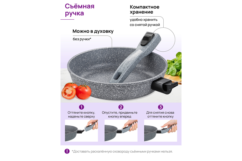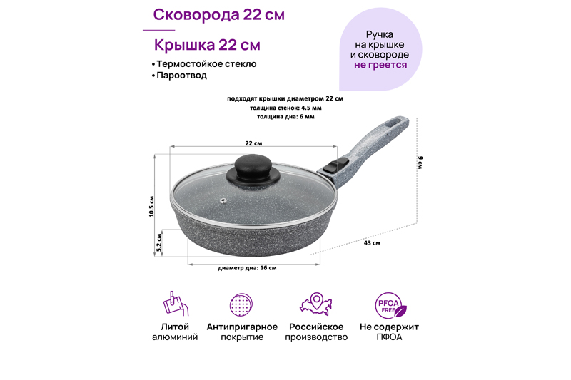 Глубокая сковорода Elan Gallery "Серый мрамор" с крышкой и съёмной ручкой из серии "Гармония вкуса" диаметром 22 см равномерно разогревается и распределяет тепло, поэтому продукты в ней сохраняют полезные свойства и сочность. Диаметр дна — 16 см. Стильный дизайн подойдет к любому интерьеру кухни. Подходит для приготовления стейков из рыбы, мяса или блюд из овощей. Сковорода с глубоким дном выполнена из толстостенного литого алюминия и имеет ультрапрочное двухслойное антипригарное покрытие Cookmark. Оно устойчиво к царапинам и износу, безопасно для здоровья и не содержит PFOA или других вредных веществ. Используйте для жарки котлет или картофеля с минимальным количеством масла. Здоровую пищу оценит любой гурман! Готовьте на завтрак оладьи или блюда из яиц: яичницу, омлет. Порадуйте близких большой порцией блинов на Масленицу, ни один блинчик не подгорит. Алюминиевая сковородка с толстым дном имеет удобную ручку, которая обеспечивает надежный захват при подаче еды с плиты на стол. Без крышки и ручки можно использовать в духовом шкафу как форму для запекания при температуре до 250°C. Не использовать съёмную ручку, чтобы достать раскалённую сковороду из духовой печи! Приготовьте румяную курочку в духовке и порадуйте своих близких. Эксплуатация: не нагревать без продуктов. Дайте посуде остыть, прежде чем помещать ее в воду. Использовать только деревянные, силиконовые и пластиковые лопатки без острых краёв. Не мыть абразивными или щелочными моющими средствами. Использовать в ПММ в режиме "Эко" со средством, не содержащим щёлочи. Подходит для стеклокерамических, газовых и электрических плит. Не подходит для индукционных плит. Кухонная утварь станет приятным подарком для женщин на День Рождения, 8 Марта и придаст процессу приготовления пищи комфорта. Подарите универсальную вещь маме, подруге, сестре или бабушке. Хорошая сковорода – мечта любой хозяйки! Сковородка станет незаменимым инвентарем на вашей кухне и наполнит процесс приготовления пищи удовольствием!