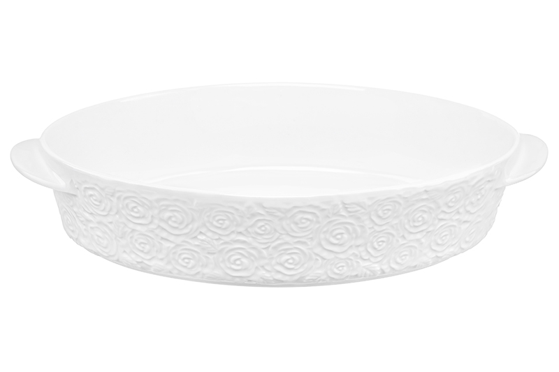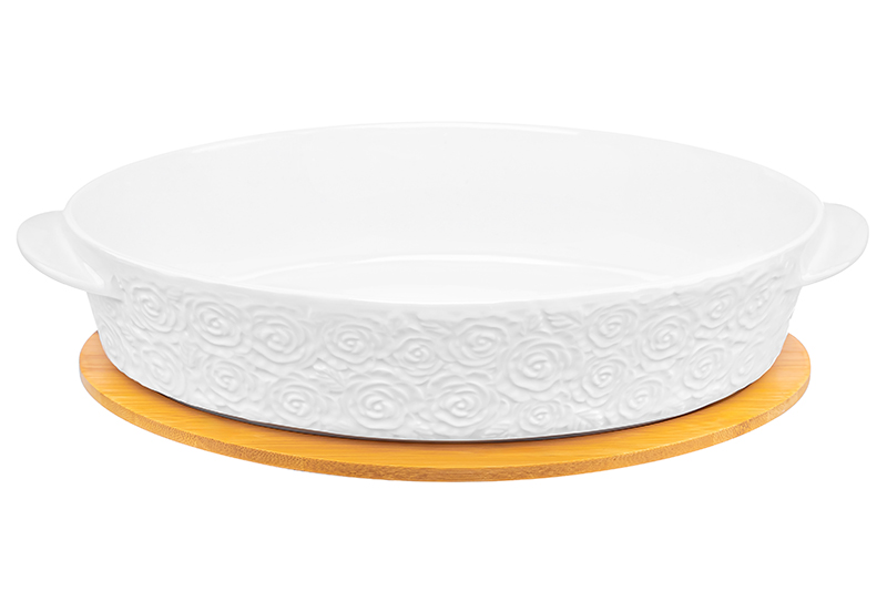 Блюдо «Розы» от Elan Gallery предназначено для запекания и сервировки горячих блюд. Размер ёмкости – 35х24х8 см, объём – 2,5 литра. Светлая Пасха – один из главных праздников весны! Мы разработали коллекцию сезонных товаров для дома, которые помогут создать радостную и уютную атмосферу в квартире или на даче. Пасхальный декор преобразит домашний интерьер и поможет встретить праздник в кругу любимых. В коллекции бренда Elan Gallery вы найдёте множество как ярких, так и нежных декоративных украшений – каждый обязательно подберёт сувенир на свой вкус. Они станут чудесным подарком для родных, близких и коллег. Наполните пространство вокруг себя радостью и весенним настроением! Внутренний размер блюда – 30х22,5х6,5 см. Выполнено из высококачественного белого фарфора. Он не впитывает цвет продуктов и легко отмывается, благодаря чему надолго сохранит свою белизну. Поверхность изделия украшена рельефным узором в виде лиственных веточек и сидящих на них птичек. Крышка выполнена из натурального бамбука. Глубокая тарелка подходит для выпечки блюд в духовом шкафу и их подачи – вам не потребуется дополнительная сервировочная посуда. Она также послужит в качестве большой салатницы и незаменимым помощником на застольях. Заполните её любимыми закусками – сырной и мясной нарезкой, свежими овощами и фруктами. Деревянная крышка может выполнять функцию подставки благодаря углублению, соответствующему размеру дна блюда. Это поможет защитить поверхности от воздействия высоких температур. Не рекомендуется применять абразивные моющие средства. Без бамбуковой крышки подходит для использования в микроволновой печи, посудомоечной машине и духовом шкафу при температуре до 230 градусов. Бамбук нельзя замачивать! Поставляется в дизайнерской картонной коробке – благодаря ей вам не потребуется дополнительная подарочная упаковка. Серия «Розы» от бренда Элан Галерея станет украшением любого кухонного инвентаря и позволит собрать сервиз в едином стиле!