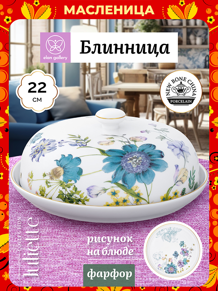 Блинница с крышкой из серии «Juliette» от Elan Gallery предназначена для эстетичной сервировки вашего стола. Размер изделия – 22х22х9,5 см. Внутренний диаметр под крышкой – 19 см. Высота без крышки – 2,5 см. Выполнена из высококачественного фарфора нового поколения new bone china, сочетающего в себе изящность и высокую прочность. Такие изделия легко отмываются, поэтому сохраняют привлекательный вид и практичны в использовании. От других видов костяного фарфора new bone china отличается большей экологичностью в производстве. Поможет отпраздновать Широкую Масленицу со вкусом! Масленица – это чудесный повод собраться за праздничным столом и насладиться тёплой атмосферой и традиционной русской кухней. В ассортименте бренда Elan Gallery вы найдёте предметы декора и красивую посуду для приготовления и сервировки масленичных блюд. Пусть Масленичная неделя принесет вам радость и множество вкусных моментов! Изделие украшено изящным цветочным рисунком и золотым окаймлением. Серия вдохновлена атмосферой очарования французской провинции и переносит нас в загадочный сад. Подойдёт не только для хранения блинчиков и оладий, но и для подачи печенья, кусочков торта и пирога. Под крышкой блины долго не остынут и сохранят свой изначальный вид и вкус. Изделие также подойдёт для сервировки сырной и мясной нарезки, бутербродов, шашлыка и кусочков пиццы. Эстетично преподнесите на ней фрукты, десерты и другие праздничные закуски. Благодаря нежному дизайну изделие гармонично впишется в интерьер любой кухни, столовой и гостиной. Не рекомендуется применять абразивные моющие средства. Не использовать в посудомоечной машине, микроволновой печи и духовом шкафу. Поставляется в дизайнерской картонной коробке – благодаря ей вам не потребуется дополнительная подарочная упаковка. Сервировочная посуда станет чудесным подарком на праздник. Серия «Juliette» от бренда Элан Галерея пробуждает романтическое воображение и поможет создать неповторимую атмосферу на любой кухне!