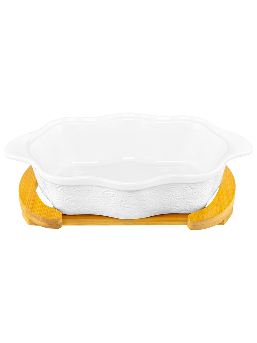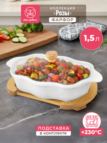 Блюдо из серии «Розы» от Elan Gallery предназначено для приготовления и эстетичной подачи ваших любимых блюд. Размер изделия – 32х20х14 см, объём – 1,5 литра. Внутренний размер блюда – 25х18 см. Выполнено из высококачественного белого фарфора. Он не впитывает цвет продуктов и легко отмывается, благодаря чему надолго сохраняет свою белизну. Поверхность изделия украшают рельефные узоры в виде пышных бутонов роз. Крышка выполнена из стекла, ручка на крышке и подставка выполнены из натурального бамбука. Изделие подойдёт для подачи сельди под шубой, салатов и плова. Используйте глубокую ёмкость в роли шубницы, чтобы порадовать гостей любимым праздничным блюдом. Послужит в качестве салатника или для подачи закусок из мяса и рыбы. Такая посуда поможет вам в приготовлении заливного и желе. Крышка поможет сохранить температуру блюд, а удобная деревянная ручка облегчит её снятие и не даст обжечься. Подставка защитит поверхности от воздействия высоких температур и послужит в качестве подноса для безопасной и комфортной подачи блюда к столу. Без крышки и подставки блюдо подойдёт для запекания бисквита и творожных запеканок. Изделие подойдёт для сервировки большого брикета мороженого, которое можно разделить с семьёй или друзьями. Не рекомендуется применять абразивные моющие средства. Без крышки и подставки подходит для использования в посудомоечной машине, микроволновой печи и духовом шкафу при температуре до 230 градусов. Бамбук нельзя замачивать! Поставляется в дизайнерской картонной коробке – благодаря ей вам не потребуется дополнительная подарочная упаковка. Фарфоровая сервировочная посуда будет оригинальным подарком для хозяйки, ценящей не только практичность, но и привлекательность. Серия «Розы» от бренда Элан Галерея станет украшением любого кухонного инвентаря и позволит собрать красивый сервиз в едином стиле!