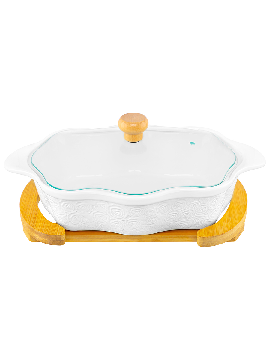 БЫЛО 2246 руб!! Блюдо д/запекания и сервировки 1,5 л 32*20*14 см "Розы" овал. ажур., стекл крышка на дер. подставке
