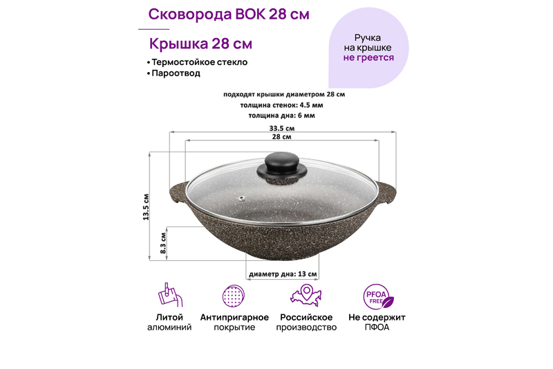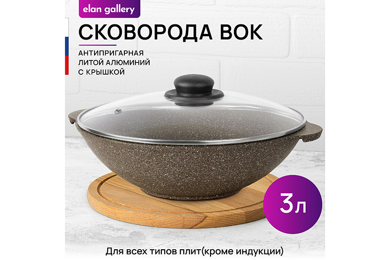 БЫЛО 2269 руб! Сковорода ВОК 28 см 3 л ГАРМОНИЯ ВКУСА "Коричневый опал" С КРЫШКОЙ ф28, 33,5*29,5*13,5 см