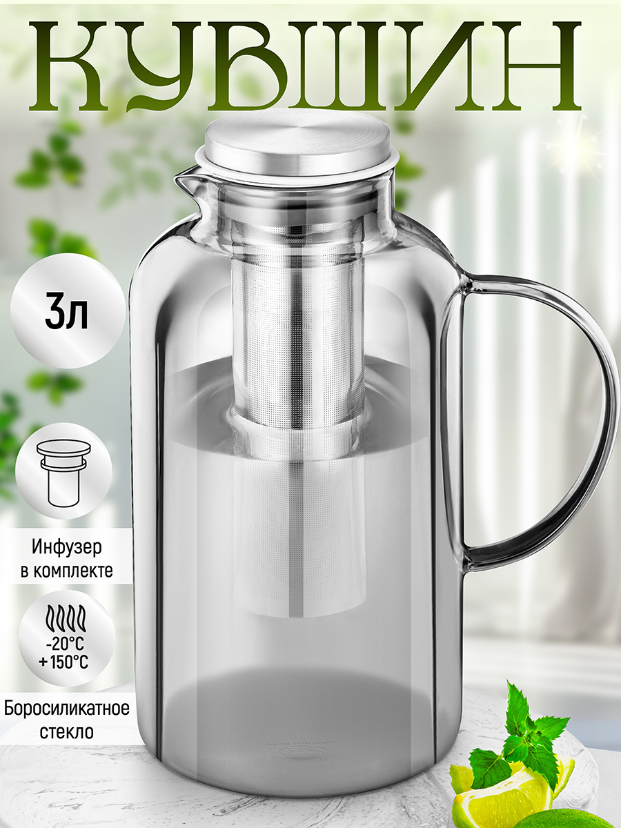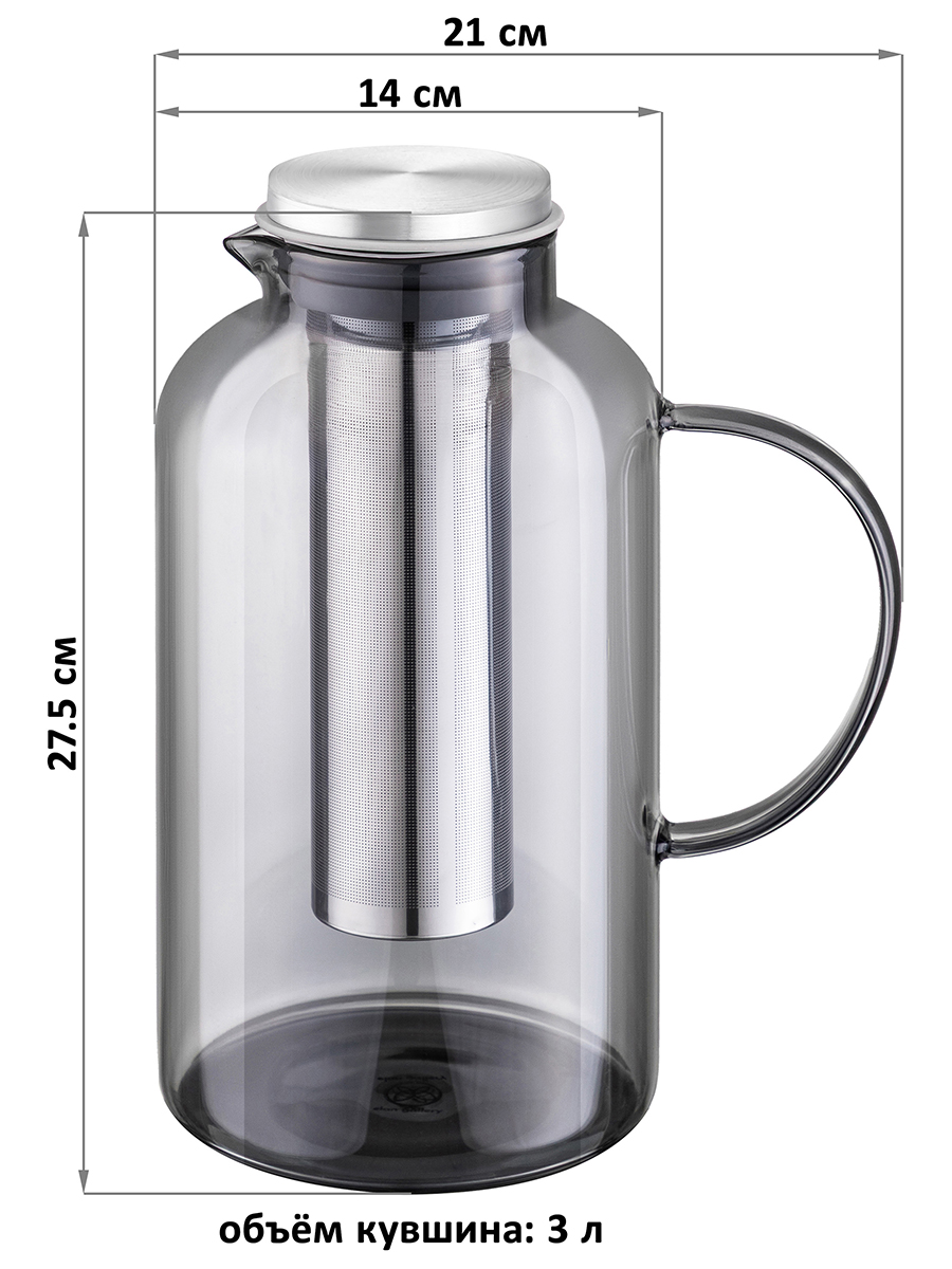 Кувшин из серии «Crystal glass» от Elan Gallery предназначен для эстетичной сервировки вашего стола. Размер изделия – 21х14х27,5 см, объём – 3 литра. Выполнен из жаропрочного боросиликатного стекла, не содержащего вредных веществ, не впитывающего запахи и вкусы. Оно выдерживает температуру от -20 до +150 градусов и подходит как для горячих, так и для прохладительных напитков. Крышка выполнена из нержавеющей стали и оснащена силиконовым уплотнителем, благодаря чему надёжно защищает содержимое от проливания, а также от пыли и грязи. Инфузер из нержавеющей стали облегчит заваривание – поместите в него чайные листья, кусочки фруктов или лёд. Ваш напиток получится чистым, без чаинок и соринок. Ёмкость можно приспособить как для чистой питьевой воды, так и под алкогольные напитки на празднике. Термостойкий кувшин позволит вам наслаждаться любимыми напитками в любое время года. Жарким летом угоститесь холодным лимонадом или ягодным компотом. Используйте полупрозрачный кувшин лаконичного серого цвета как лимонадницу или для эстетичной подачи вина и коктейлей. Зимой или дождливой осенью угоститесь горячим ароматным глинтвейном. Не рекомендуется применять абразивные моющие средства. Не использовать для разогрева жидкостей на плите, на открытом огне или в духовом шкафу. Не подходит для использования в посудомоечной машине. Поставляется в дизайнерской картонной коробке – благодаря ей вам не потребуется дополнительная подарочная упаковка. Такой сосуд станет отличным подарком для хозяйки, ценящей не только практичность, но и привлекательность. В коллекции бренда Элан Галерея множество красивой посуды, которая поможет создать уют на вашей кухне!