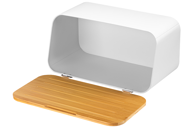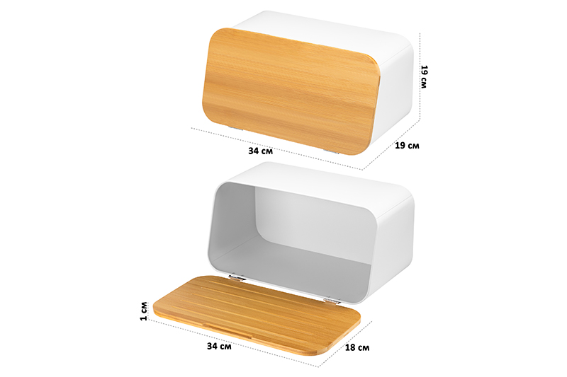 Белая хлебница 34х19х19 см с бамбуковой крышкой-доской поможет сохранить хлеб и булочки вкусными и свежими. Хлебница из металла не впитывает запахи, держит температуру, предотвращает попадание влаги, а значит – защитит продукты от плесени. Настольная хлебница имеет стильный дизайн и надежно закрывается бамбуковой крышкой. Её особенность – необычный функционал 2 в 1. Вам больше не понадобится отдельная доска для того, чтобы нарезать хлеб перед подачей на стол. Просто откройте крышку и используйте её как доску. Ёмкость можно приспособить не только под хлеб, но и для хранения пакетов с крекерами, печеньем, сухарями. Бамбуковые детали нельзя замачивать. Поставляется в стильной картонной упаковке. Металлическая хлебница подойдёт в подарок любой хозяйке. Такая посуда станет настоящим украшением вашей кухни и поможет создать в доме порядок и уют!