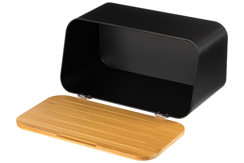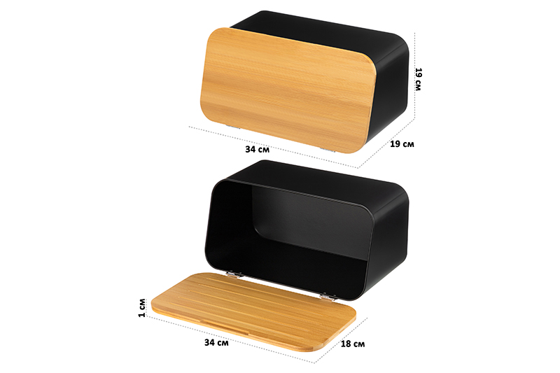 Чёрная хлебница 34х19х19 см с бамбуковой крышкой-доской поможет сохранить хлеб и булочки вкусными и свежими. Хлебница из металла не впитывает запахи, держит температуру, предотвращает попадание влаги, а значит – защитит продукты от плесени. Настольная хлебница имеет стильный дизайн и надежно закрывается бамбуковой крышкой. Её особенность – необычный функционал 2 в 1. Вам больше не понадобится отдельная доска для того, чтобы нарезать хлеб перед подачей на стол. Просто откройте крышку и используйте её как доску. Ёмкость можно приспособить не только под хлеб, но и для хранения пакетов с крекерами, печеньем, сухарями. Бамбуковые детали нельзя замачивать. Поставляется в стильной картонной упаковке. Металлическая хлебница подойдёт в подарок любой хозяйке. Такая посуда станет настоящим украшением вашей кухни и поможет создать в доме порядок и уют!