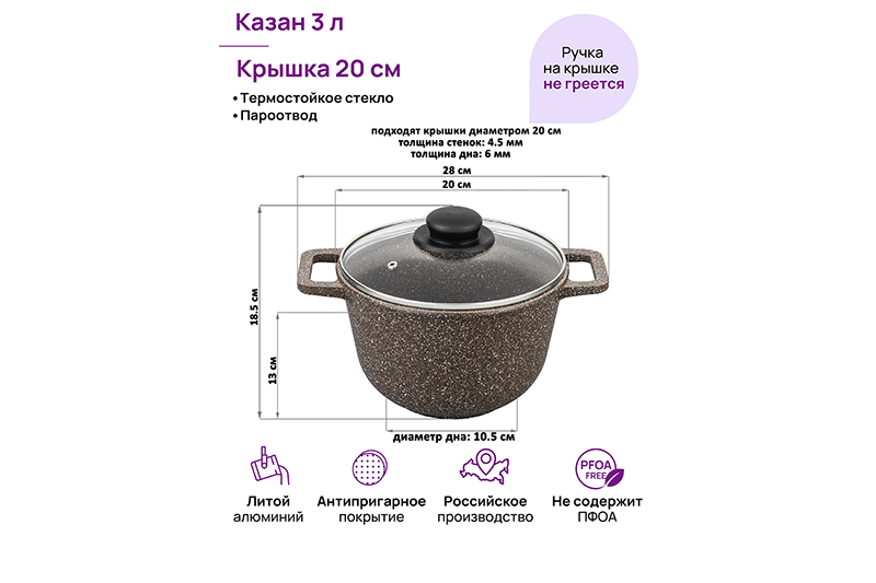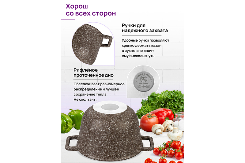 Казан "Гармония вкуса" объемом 3 литра с крышкой равномерно разогревается и распределяет тепло таким образом, что продукты в нем остаются сочными и сохраняют все свои полезные и вкусовые свойства. Казан выполнен из толстостенного литого алюминия и имеет ультрапрочное двухслойное антипригарное покрытие Cookmark. Покрытие устойчиво к царапинам и износу, полностью безопасно для здоровья и не содержит PFOA или других вредных веществ. Эксплуатация: не нагревать без продуктов. Дайте посуде остыть, прежде чем помещать ее в воду. Использовать только деревянные и силиконовые приборы. Не мыть абразивными или щелочными моющими средствами. Использовать в посудомоечной машине только в режиме "Эко". Подходит для всех типов плит, кроме индукционных. Можно использовать в духовом шкафу без крышки при температуре до 250 градусов.