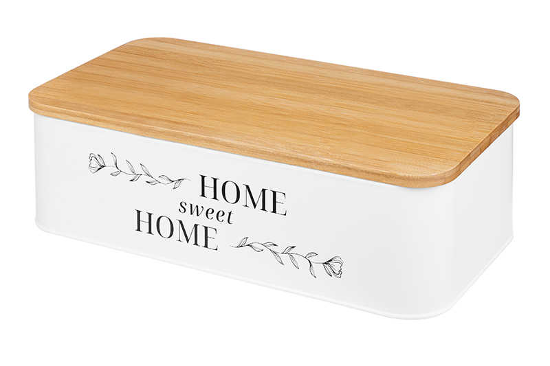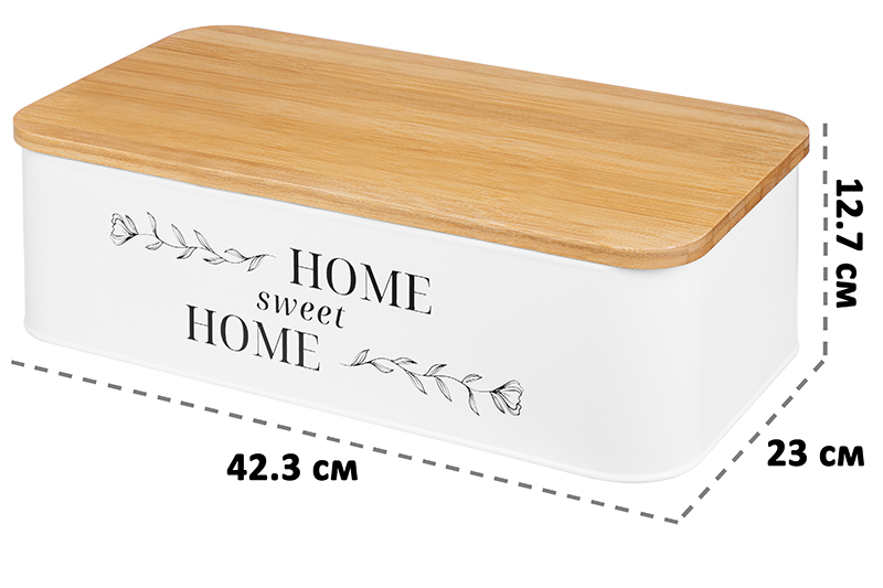 Контейнер для хранения 42,3х23х12,7 см хорошо впишется в интерьер и поможет организовать хранение в разных комнатах. Выполнен из металла и имеет бамбуковую крышку. Украшен надписью "home, sweet home" - "дом, милый дом". На кухне большую коробку можно использовать для овощей, как хлебницу или фруктовницу. Крышку будет удобно использовать как разделочную доску. В ванной короб подойдет для хранения бытовой химии, косметики и других мелочей. В прихожей коробочка поможет организовать хранение одежды - шапок, перчаток, шарфов. В спальне можно использовать как шкатулку для украшений, рукоделия (пряжи, вязания), аксессуаров или кофр для нижнего белья. Бокс подходит для хранения документов и бумаги А4. Металлический органайзер украсит интерьер, поможет создать систему для хранения вещей и эффективно использовать каждый сантиметр пространства.