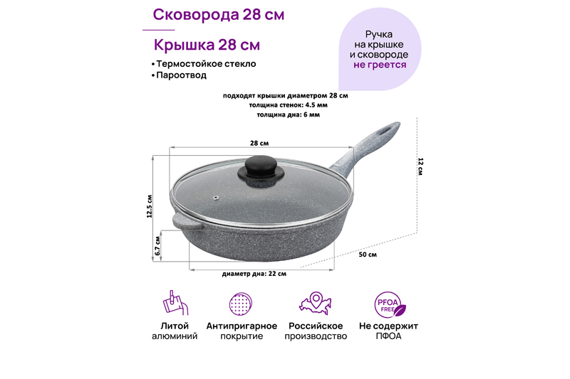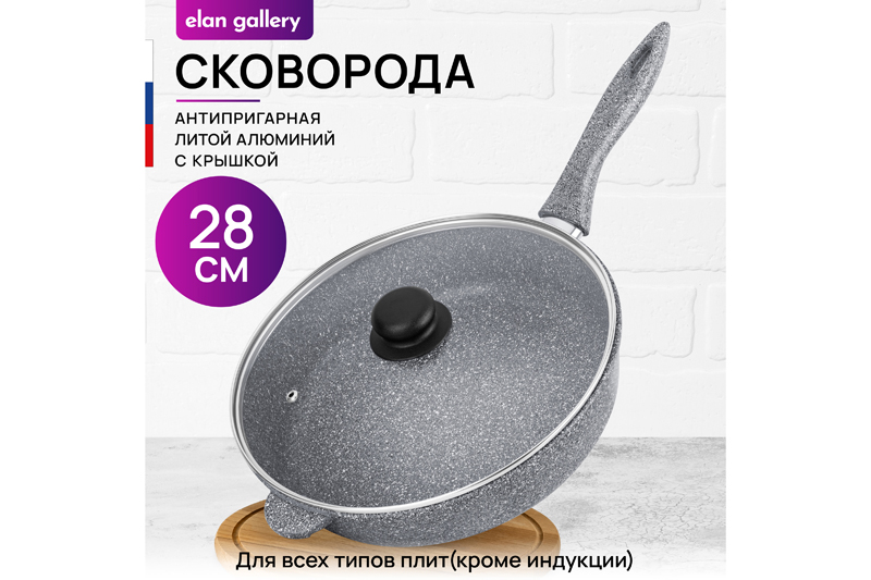 Глубокая сковорода Elan Gallery "Серый мрамор" с крышкой и несъёмной ручкой из серии "Гармония вкуса" диаметром 28 см равномерно разогревается и распределяет тепло, поэтому продукты в ней сохраняют полезные свойства и сочность. Диаметр дна — 22 см. Стильный дизайн подойдет к любому интерьеру кухни. Подходит для приготовления стейков из рыбы, мяса или блюд из овощей. Сковорода с глубоким дном выполнена из толстостенного литого алюминия и имеет ультрапрочное двухслойное антипригарное покрытие Cookmark. Оно устойчиво к царапинам и износу, безопасно для здоровья и не содержит PFOA или других вредных веществ. Используйте для жарки котлет или картофеля с минимальным количеством масла. Здоровую пищу оценит любой гурман! Готовьте на завтрак оладьи или блюда из яиц: яичницу, омлет. Порадуйте близких большой порцией блинов на Масленицу, ни один блинчик не подгорит. Алюминиевая сковородка с толстым дном имеет удобную ручку, которая обеспечивает надежный захват при подаче еды с плиты на стол. Эксплуатация: не нагревать без продуктов. Дайте посуде остыть, прежде чем помещать ее в воду. Использовать только деревянные, силиконовые и пластиковые лопатки без острых краёв. Не мыть абразивными или щелочными моющими средствами. Использовать в ПММ в режиме "Эко" со средством, не содержащим щёлочи. Подходит для стеклокерамических, газовых и электрических плит. Не подходит для индукционных плит. Кухонная утварь станет приятным подарком для женщин на День Рождения, 8 Марта и придаст процессу приготовления пищи новый уровень комфорта. Подарите универсальную вещь маме, подруге, сестре или бабушке. Хорошая сковорода – мечта любой хозяйки! Готовьте с радостью и любовью, создавая вкусные блюда для себя и своих гостей. Сковородка станет незаменимым инвентарем на вашей кухне и наполнит процесс приготовления пищи удовольствием!
