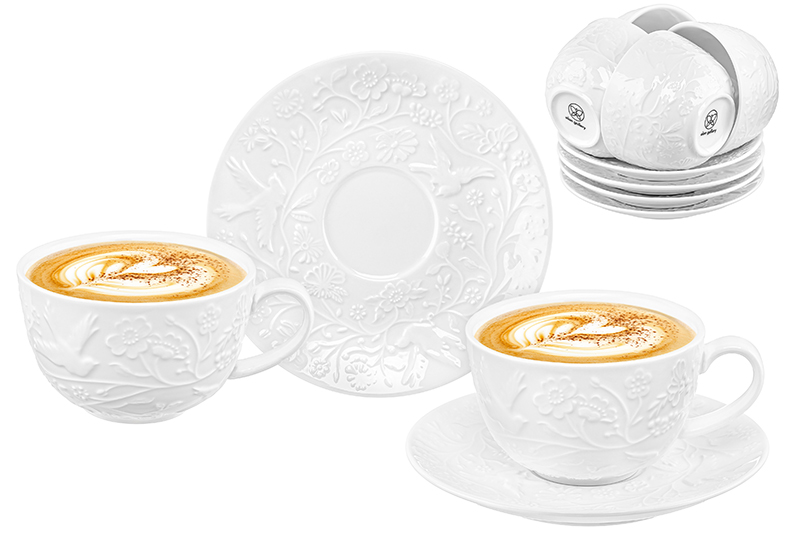 Набор 6 чайных пар из серии «Райский сад» от Elan Gallery предназначен для эстетичной сервировки вашего стола. Размер каждой ёмкости – 13х10х6,5 см, объём – 300 мл. Размер каждого блюдца – 16х16х1,8 см. Выполнены из высококачественного белого фарфора. Он не впитывает цвет напитков и легко отмывается, благодаря чему надолго сохраняет свою белизну. Поверхность изделий овивают тонкие лиственные и цветочные веточки, возле которых порхают выразительные птицы. Кофейные кружки помогут вам провести множество приятных завтраков с капучино и латте, а также уютные чайные вечера с конфетами, вафлями, другими десертами и сладостями. Подойдут ценителям чая и кофе, которые любят пить из красивой и необычной посуды. Согрейтесь зимой любимыми напитками: какао с маршмэллоу, ягодным чаем и горячим шоколадом. Летом освежитесь домашним лимонадом или морсом. Используйте сервировочные блюдца как подставки для чашек, чтобы порадовать гостей изящной сервировкой. Положите на десертные тарелки пирожное, кусочек торта или домашнего пирога. Подойдут не только для десертов, но и для закусок: сырной нарезки, сырокопчёной колбасы или свежих овощей и зелени. Декоративные изделия позволят организовать запоминающееся чаепитие. Не рекомендуем применять абразивные моющие средства. Подходят для использования в микроволновой печи и посудомоечной машине. Поставляются в дизайнерской картонной коробке – благодаря ей вам не потребуется дополнительная подарочная упаковка. Фарфоровая сервировочная посуда будет оригинальным подарком для хозяйки, ценящей не только практичность, но и привлекательность. Серия «Райский сад» от бренда Элан Галерея станет украшением любого кухонного инвентаря и позволит собрать красивый сервиз в едином стиле!