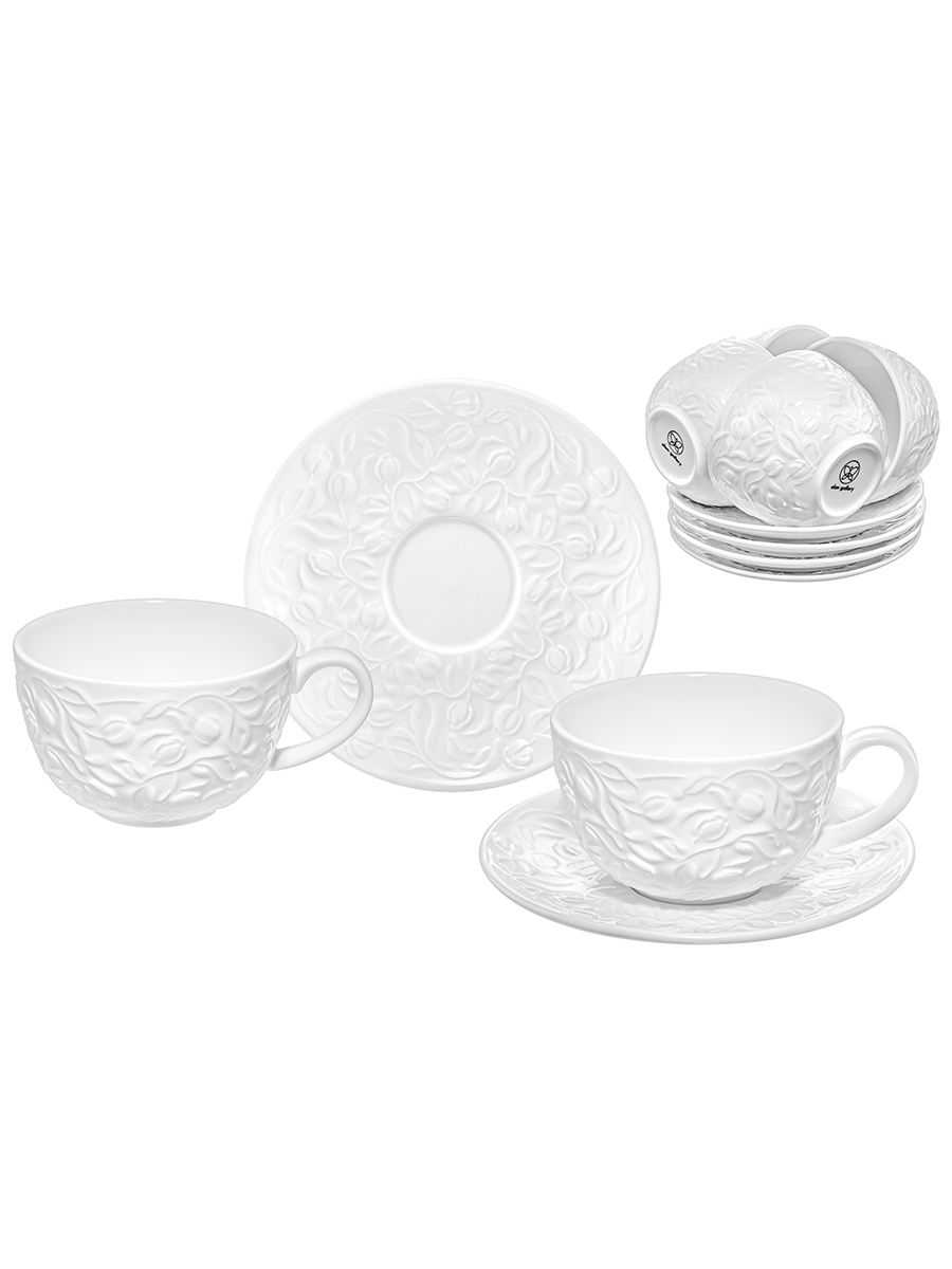 Чайный набор Elan Gallery "Тюльпаны" состоит из 12 предметов. Выполнен из белого фарфора и украшен изящными рельефными узорами с цветами. Можно использовать как кофейный или для сервировки любых других напитков. В состав набора входят 6 чашек объёмом 300 мл и размером 13х10х6,5 см каждая, 6 блюдец размерами 16х16х2 см. Фарфоровый набор на шесть персон подходит для любителей чая и кофе. Вы сможете насладиться любимыми напитками из красивой кружки и удивить своих гостей. Используйте блюдце как подставку под чашку. Положите на тарелочку кусочек торта, домашнего пирога или пирожное. Сервировочная тарелка подойдёт не только для десерта, но и закусок: сырной нарезки, сырокопчёной колбасы или свежих овощей и зелени. Посуда из фарфора украсит интерьер вашей кухни. Разместите на блюдце кусочки шашлыка или бутерброды, чтобы перекусить за чашечкой кофе. Беречь от механических повреждений и резких перепадов температур. Не рекомендуется применять абразивные моющие средства. Можно использовать в микроволновой печи и мыть в посудомоечной машине. Поставляется в картонной коробке. Фарфоровая посуда – приятный подарок на любой праздник. Благодаря красочной коробочке не понадобится подарочная упаковка. В коллекции бренда Элан Галерея представлено много красивого кофейного и чайного инвентаря, выберите сервиз на свой вкус. Набор 6 чайных пар станет украшением праздничного стола или добавит эстетики ежедневному чаепитию!