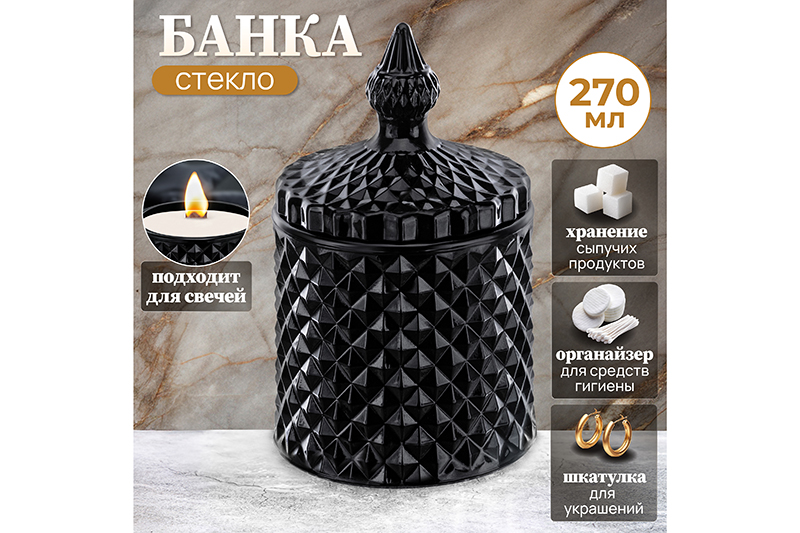 БЫЛО 348 руб! Банка д/хранения 270 мл 8,5*8,5*14 см с крышкой "Ромбики", черный, стекло