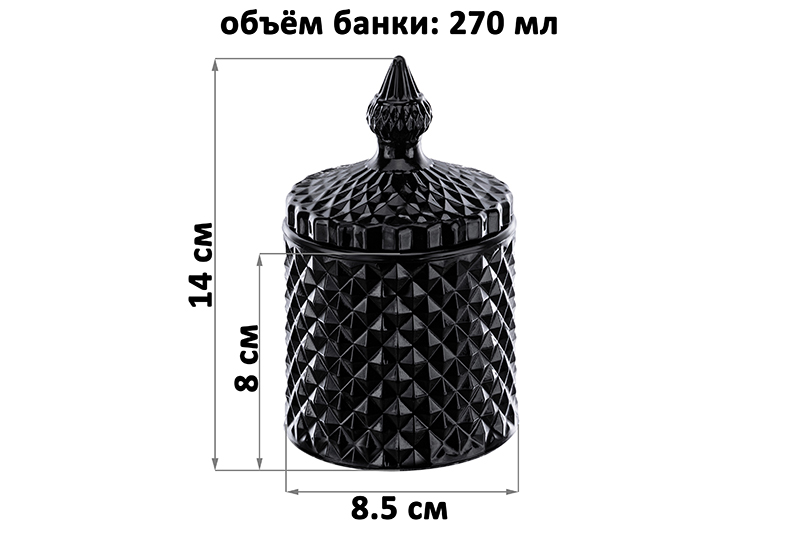 Банка для хранения Elan Gallery "Ромбики" чёрного цвета выполнена из стекла и украшена декоративным рельефным узором. Размер изделия – 8,5х8,5х14 см, объём – 270 мл. Высота без крышки – 8 см. Баночка с фигурной крышкой подойдёт для хранения мёда, варенья, сахара и соли. Можно использовать её как ёмкость для чая, кофе и других сыпучих продуктов. Декоративная баночка округлой формы станет гармоничным дополнением при сервировке вашего стола как в будни, так и на праздник. Красивый дизайн позволит использовать её не только для хранения продуктов, но и для подачи на стол в роли медового горшочка. Положите в неё конфеты или икру, чтобы удивить гостей изящной сервировкой. Стеклянную ёмкость с крышечкой можно использовать не только как сахарницу, икорницу или соусник, но и для специй и приправ. Это позволит держать под рукой всё необходимое во время приготовления и приёма пищи. На даче медовница будет незаменимой для семейного чаепития, а также подойдёт для подачи ягод. В качестве альтернативы красивый бочонок можно использовать как шкатулку или органайзер для ватных палочек, дисков и других предметов гигиены. Сложите в неё украшения, бижутерию, а также резинки и заколки. Подходит в роли формы для свечей. Не рекомендуется применять абразивные моющие средства. Нельзя использовать в посудомоечной машине и микроволновой печи. Поставляется в картонной упаковке. Красивая посуда – это отличный подарок на любой праздник. Баночка для хранения станет многофункциональным дополнением вашего кухонного инвентаря или интерьерным украшением ванной и комнаты!