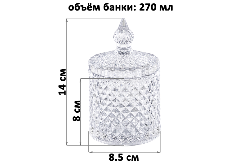 Банка для хранения Elan Gallery "Ромбики" выполнена из прозрачного стекла и украшена декоративным рельефным узором. Размер изделия – 8,5х8,5х14 см, объём – 270 мл. Высота без крышки – 8 см. Прозрачная баночка с фигурной крышкой подойдёт для хранения мёда, варенья, сахара и соли. Можно использовать её как ёмкость для чая, кофе и других сыпучих продуктов. Декоративная баночка округлой формы станет гармоничным дополнением при сервировке вашего стола как в будни, так и на праздник. Красивый дизайн позволит использовать её не только для хранения продуктов, но и для подачи на стол в роли медового горшочка. Положите в неё конфеты или икру, чтобы удивить гостей изящной сервировкой. Стеклянную ёмкость с крышечкой можно использовать не только как сахарницу, икорницу или соусник, но и для специй и приправ. Это позволит держать под рукой всё необходимое во время приготовления и приёма пищи. На даче медовница будет незаменимой для семейного чаепития, а также подойдёт для подачи ягод. В качестве альтернативы красивый бочонок можно использовать как шкатулку или органайзер для ватных палочек, дисков и других предметов гигиены. Сложите в неё украшения, бижутерию, а также резинки и заколки. Подходит в роли формы для свечей. Не рекомендуется применять абразивные моющие средства. Можно мыть в посудомоечной машине. Нельзя использовать в микроволновой печи. Поставляется в картонной упаковке. Красивая посуда – это отличный подарок на любой праздник. Баночка для хранения станет многофункциональным дополнением вашего кухонного инвентаря или интерьерным украшением ванной и комнаты!
