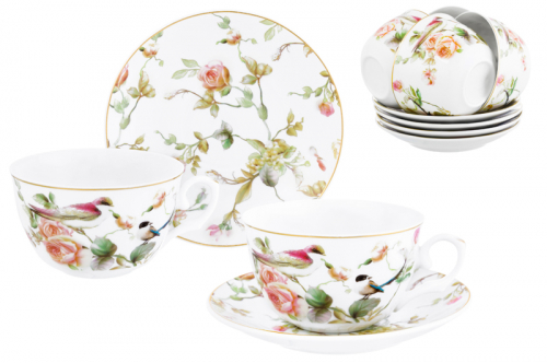 Чайный набор Elan Gallery "Певчие птички" станет украшением вашей кухни. Комплект на 6 персон выполнен из фарфора нового поколения new bone china. За счёт гладкости изделия легко отмываются, поэтому сохраняют привлекательный внешний вид и практичны в использовании. От классического костяного фарфора new bone china отличается большей экологичностью в производстве. Посуда с изображениями птичек и розовых цветов украшена золотистым кантом. Набор состоит из шести чашек объёмами по 250 мл и шести блюдец размерами по 14х14х2,5 см. Чайные пары подходят любителям чая и кофе, которые любят пить из красивой и необычной посуды. Благодаря праздничному чайному набору вы можете удивить гостей изящной сервировкой. Используйте блюдца как подставки под чашки. Положите на тарелочки кусочки торта, домашнего пирога или пирожные. Сервировочные тарелки подойдут не только для десерта, но и закусок: сырной нарезки, сырокопчёной колбасы или свежих овощей и зелени. Разместите на каждом блюдце кусочки шашлыка или бутерброды, чтобы угостить гостей. Не рекомендуется применять абразивные моющие средства. Из-за золотого окаймления комплект нельзя использовать в микроволновой печи и мыть в посудомоечной машине. Поставляется в стильной картонной коробке. Благодаря красочной коробочке вам не понадобится дополнительная подарочная упаковка, если вы решите сделать сюрприз своим близким. Чайный набор станет украшением вашей кухни или приятным подарком на любой праздник для тех, кто ценит изящную сервировку. В коллекции бренда Элан Галерея вы найдёте много стильных товаров для дома, кухонного инвентаря и всё для эстетичного чаепития. Выберите варианты на свой вкус!