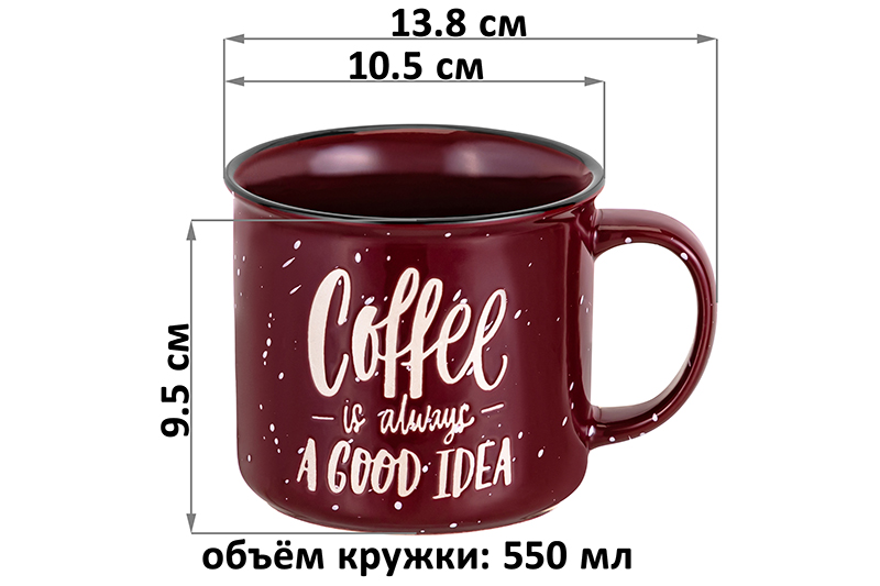 Декоративная кружка предназначена для красивой сервировки стола. Размер ёмкости – 13,8х10,5х9,5 см, объём – 550 мл. Вместительная кружечка бордового цвета выполнена из качественной керамики и украшена лаконичной надписью «Coffee is always a good idea» («Кофе – всегда хорошая идея»). Имеет оригинальный рисунок в виде гранитной крошки. Декоративная чашка поможет провести множество завтраков с капучино и латте, а также уютные чайные вечера. Она подойдёт для ценителей чая и кофе, которые любят пить из красивой и необычной посуды. Согрейтесь горячим напитком зимой или освежитесь лимонадом летом. Не рекомендуется применять абразивные моющие средства. Подойдёт для использования в посудомоечной машине и микроволновой печи. Поставляется в красивой картонной коробке – благодаря ей вам не потребуется дополнительная подарочная упаковка. Это идеальный подарок для хозяйки, ценящей не только практичность, но и стиль. Подчеркните свой утончённый вкус, используя красивую и функциональную посуду каждый день! Она позволит наслаждаться ароматными напитками и почувствовать тепло и уют, где бы вы ни находились.