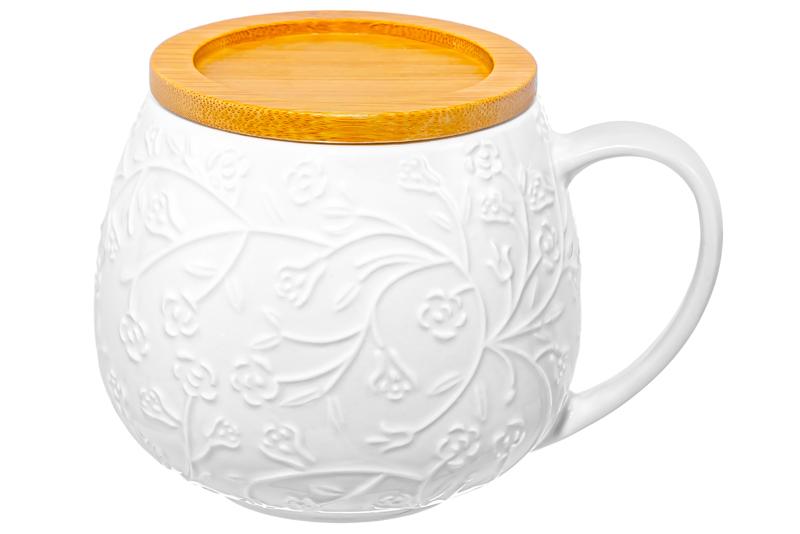 Кружка из серии «Веточки-цветочки» от Elan Gallery предназначена для эстетичной сервировки вашего стола. Размер изделия – 12,5х10х9,7 см, объём – 400 мл. Выполнена из высококачественного белого фарфора. Он не впитывает цвет напитков и легко отмывается, благодаря чему надолго сохраняет свою белизну. Поверхность изделия украшают рельефные узоры в виде лиственных веточек с аккуратными цветочными бутончиками. Крышка-подставка выполнена из натурального бамбука. Кофейная кружка поможет вам провести множество приятных завтраков с капучино и латте, а также уютные чайные вечера с конфетами, вафлями, другими десертами и сладостями. Подойдёт ценителям чая и кофе, которые любят пить из красивой и необычной посуды. Согрейтесь зимой любимым горячим напитком: какао с маршмэллоу, ягодным чаем или горячим шоколадом. Летом освежитесь домашним лимонадом или морсом. Бамбуковый элемент может служить как подставкой для защиты поверхностей от воздействия высоких температур, так и крышкой, защищающей напитки от пыли и грязи. Декоративное изделие позволит организовать запоминающееся чаепитие. Не рекомендуется применять абразивные моющие средства. Без бамбуковой подставки подходит для использования в посудомоечной машине и микроволновой печи. Бамбук нельзя замачивать! Поставляется в дизайнерской картонной коробке – благодаря ей вам не потребуется дополнительная подарочная упаковка. Фарфоровая сервировочная посуда будет оригинальным подарком для хозяйки, ценящей не только практичность, но и привлекательность. Серия «Веточки-цветочки» от бренда Элан Галерея станет украшением любого кухонного инвентаря и позволит собрать красивый сервиз в едином стиле!