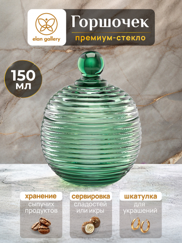 Горшочек для мёда Elan Gallery "Каскад" с крышкой выполнен из стекла и украшен декоративным рельефным узором в виде горизонтальных полосок. Размер изделия – 8,2х8,2х11 см, объём – 150 мл. Высота без крышки – 5,2 см. Баночка зелёного цвета с полосатым рельефом подойдёт для хранения мёда, варенья, сахара и соли. Можно использовать её как ёмкость для чая, кофе и других сыпучих продуктов. Поможет отпраздновать Широкую Масленицу со вкусом! Масленица – это чудесный повод собраться за праздничным столом и насладиться тёплой атмосферой и традиционной русской кухней. В ассортименте бренда Elan Gallery вы найдёте предметы декора и красивую посуду для приготовления и сервировки масленичных блюд. Пусть Масленичная неделя принесет вам радость и множество вкусных моментов! Декоративная баночка круглой формы станет гармоничным дополнением при сервировке вашего стола как в будни, так и на праздник. Красивый дизайн позволит использовать её не только для хранения продуктов, но и для подачи на стол. Положите в неё конфеты или икру, чтобы удивить гостей изящной сервировкой. Стеклянную ёмкость с крышечкой можно использовать не только как сахарницу, икорницу или соусник, но и для специй и приправ. Это позволит держать под рукой всё необходимое во время приготовления и приёма пищи. На даче медовница будет незаменимой для семейного чаепития, а также подойдёт для подачи ягод. В качестве альтернативы красивую вазочку с крышкой можно использовать как шкатулку или органайзер. Сложите в неё украшения и любые маленькие предметы. Подходит в роли стакана для свечи. Не рекомендуется применять абразивные моющие средства. Нельзя использовать в микроволновой печи и посудомоечной машине. Поставляется в стильной картонной упаковке. Красивая посуда – это отличный подарок на любой праздник. Медовый бочонок "Каскад" станет многофункциональным дополнением вашего кухонного инвентаря и украсит домашний интерьер!