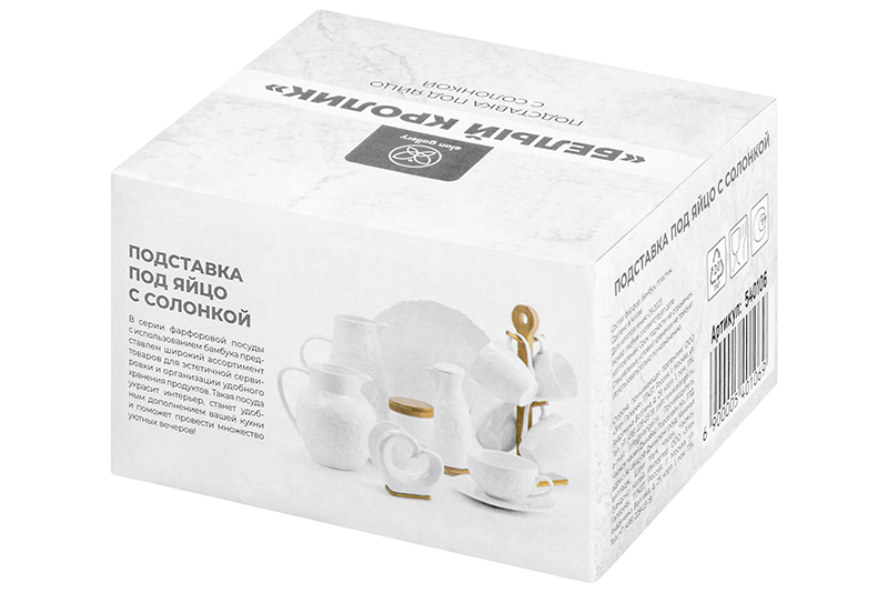 Набор из подставки под яйцо Elan Gallery "Белый кролик" и солонки поможет эстетично сервировать стол для завтрака. Размер фарфоровой подставки под яйцо – 4,8х4,8х4 (объём 20 мл), размер солонки – 7х5х7 см (объём 25 мл). Фигурка оригинальной формы и ёмкость для соли выполнены из белого фарфора, имеют бамбуковую подставку в комплекте. Такая вещь станет настоящим украшением вашей кухни или столовой. Держатель в виде зайца на подставке из бамбука – красивое приспособление для изящной сервировки яйца, сваренного вкрутую или всмятку. Милый зайчик поднимет настроение взрослым и детям. Фарфоровая посуда отличается от керамики повышенной плотностью. Кухонный инвентарь из этого материала не впитывает цвет и не деформируется от влаги, чему может быть подвержена керамическая посуда. Зайку – яичную подставку можно использовать в роли соусника. Пашотница и солонка подойдут для создания декоративных композиций с крашеными яичками и украшения пасхального стола. Без бамбуковой подставки можно использовать в микроволновой печи и посудомоечной машине. Бамбук нельзя замачивать! Поставляется в яркой картонной упаковке (коробке). Сервировочная формочка и солонка станут приятным подарком или детским сюрпризом на праздник. Красивые декоративные вещи – всегда приятный подарок для близких или вашего коллеги. Настольная подставка для яиц с солонкой станет украшением интерьера вашей кухни и поможет создать дома тепло и уют. В коллекции бренда Elan Gallery вы найдёте большой выбор декоративной посуды и сувениров – каждый обязательно подберёт вариант на свой вкус. Изделия станут чудесным подарком для родных, близких и коллег. Наполните пространство вокруг себя уютом и эстетикой!