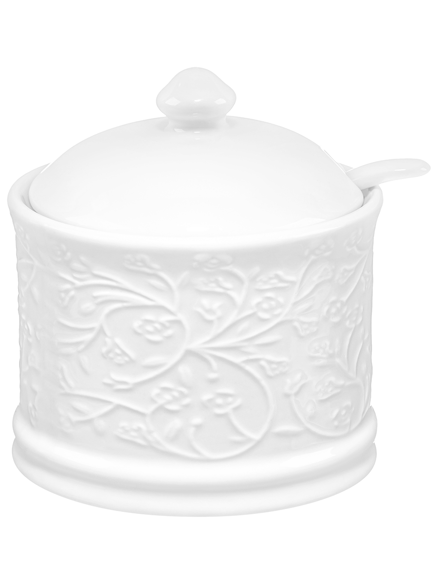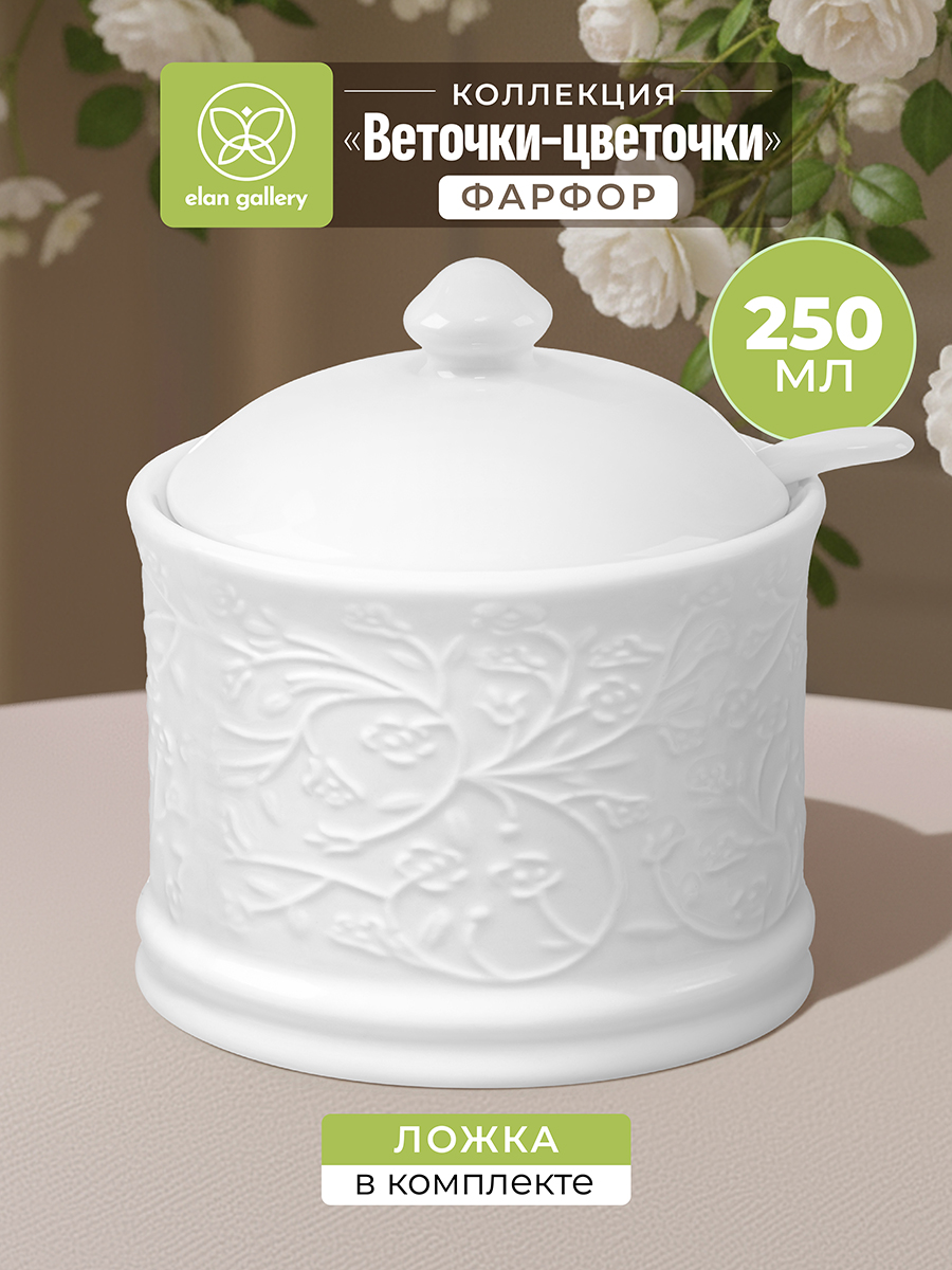 Сахарница из серии «Веточки-цветочки» от Elan Gallery предназначена для эстетичной сервировки вашего стола. Размер ёмкости – 9х9х10 см, объём – 250 мл. Выполнена из высококачественного белого фарфора. Он не впитывает цвет продуктов и легко отмывается, благодаря чему надолго сохранит свою белизну. Поверхность изделия украшают рельефные узоры в виде лиственных веточек с аккуратными цветочными бутончиками. Поставляется в комплекте с фарфоровой ложкой размером 11х2,5 см. Декоративная баночка добавит особого шарма вашему кухонному инвентарю. Она подойдёт для хранения не только сахара, но и соли, специй и приправ. Засыпьте внутрь чай или кофе, чтобы в любой момент заварить свежий напиток. Подайте её вместе с горячими блюдами, чтобы каждый мог приправить пищу по своему вкусу. Поможет отпраздновать Широкую Масленицу со вкусом! Масленица – это чудесный повод собраться за праздничным столом и насладиться тёплой атмосферой и традиционной русской кухней. Стильное изделие также можно приспособить под варенье, мёд или икру. Маленькая ложечка позволит набрать необходимое количество продуктов. Она компактно помещается в баночке благодаря выемке на крышке. Такое изделие отлично дополнит сервировку стола как для сытного завтрака, так и для уютного чаепития. Не рекомендуется применять абразивные моющие средства. Подходит для использования в посудомоечной машине и микроволновой печи. Поставляется в дизайнерской картонной коробке – благодаря ей вам не потребуется дополнительная подарочная упаковка. Фарфоровая сервировочная посуда будет оригинальным подарком для хозяйки, ценящей не только практичность, но и привлекательность. В ассортименте бренда Elan Gallery вы найдёте предметы декора и красивую посуду для приготовления и сервировки масленичных блюд. Пусть Масленичная неделя принесет вам радость и множество вкусных моментов!